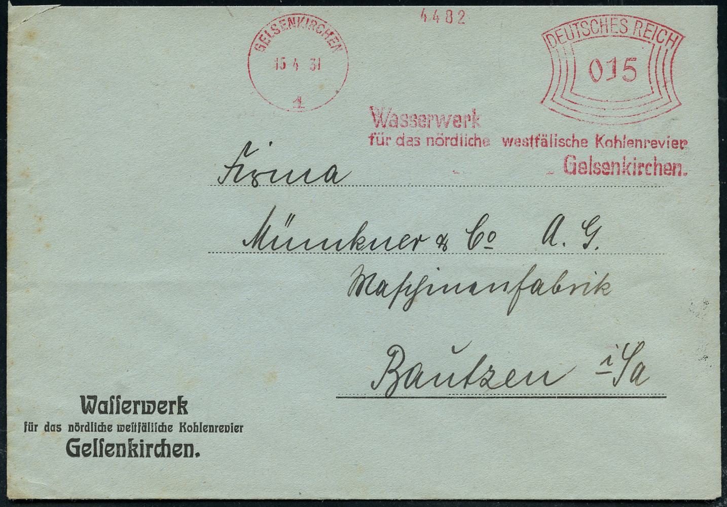 8240 | 20 € | 4650 Gelsenkirchen Post- u. Absender-Freistempel : GELSENKIRCHEN/ 1/ Wasserwerk/ für die nördliche westfäl. Kohlenrevier.. 1931 (15.4.) AFS Francotyp "Bogenrechteck" auf entspr. Dienst-Bf. n. Bautzen (Dü.E-1CEh) | ![]() | |