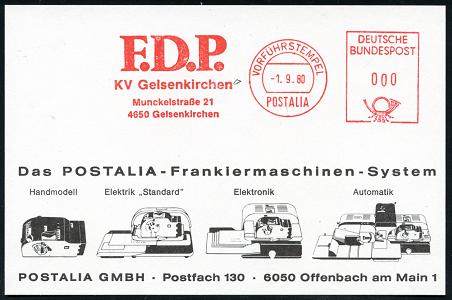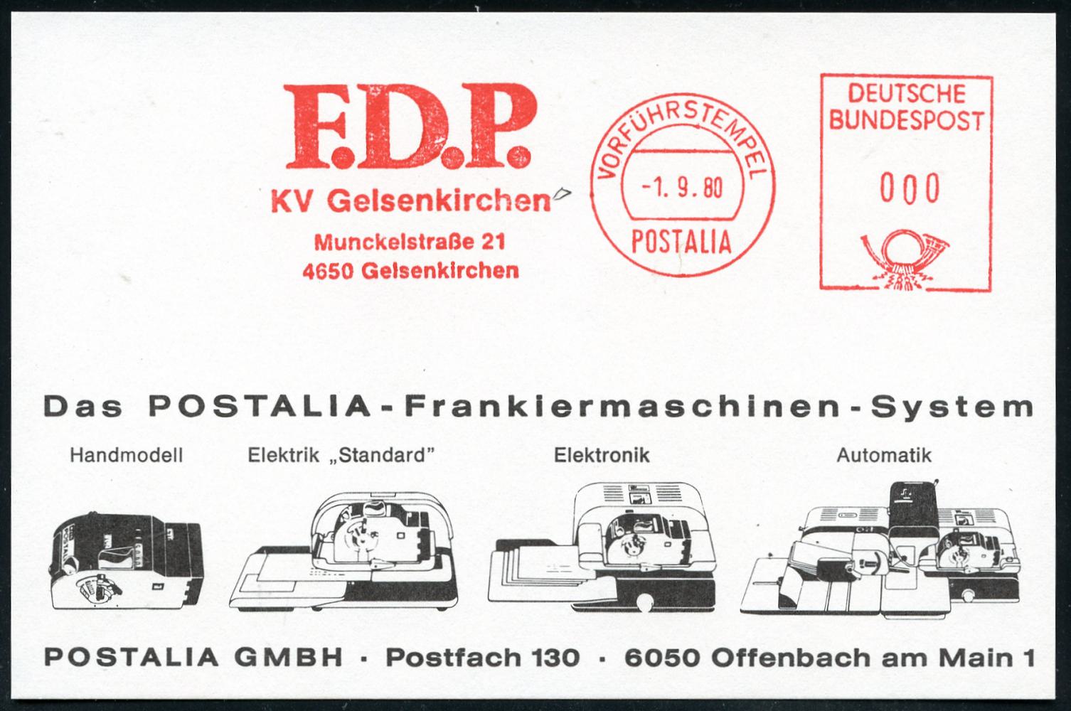8261 | 18 € | 4650 Gelsenkirchen Post- u. Absender-Freistempel : 4650 Gelsenkirchen 1980 (1.9.) AFS: VORFÜHRSTEMPEL/POSTALIA/F.D.P./KV Gelsenkirchen auf seltener Postalia-. Musterkt.! (= Specimen) | ![]() | |