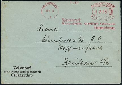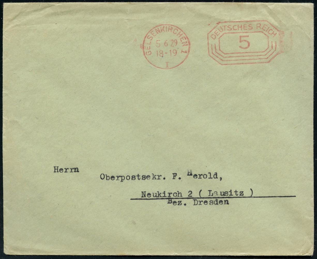 8238 | 10 € | 4650 Gelsenkirchen Post- u. Absender-Freistempel : GELSENKIRCHEN 1/ I/ DEUTSCHES REICH 1929 (5.6.) PFS "Achteck" 5 Pf. auf Inl.-Drs.-Bf. (Dü.D-4) | ![]() | |
