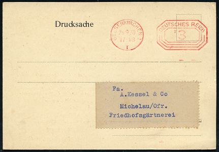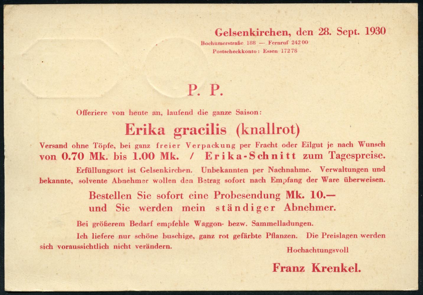 8239 | 16 € | 4650 Gelsenkirchen Post- u. Absender-Freistempel : GELSENKIRCHEN 1/ I/ DEUTSCHES REICH 1930 (25.9.) PFS "Achteck" auf Reklame-Kt. Fa. Franz Krenkel für rot gefärbte Erika-Pflanzen (Erika gracilis) (Dü.D-4) | ![]() ![]() | |