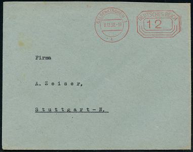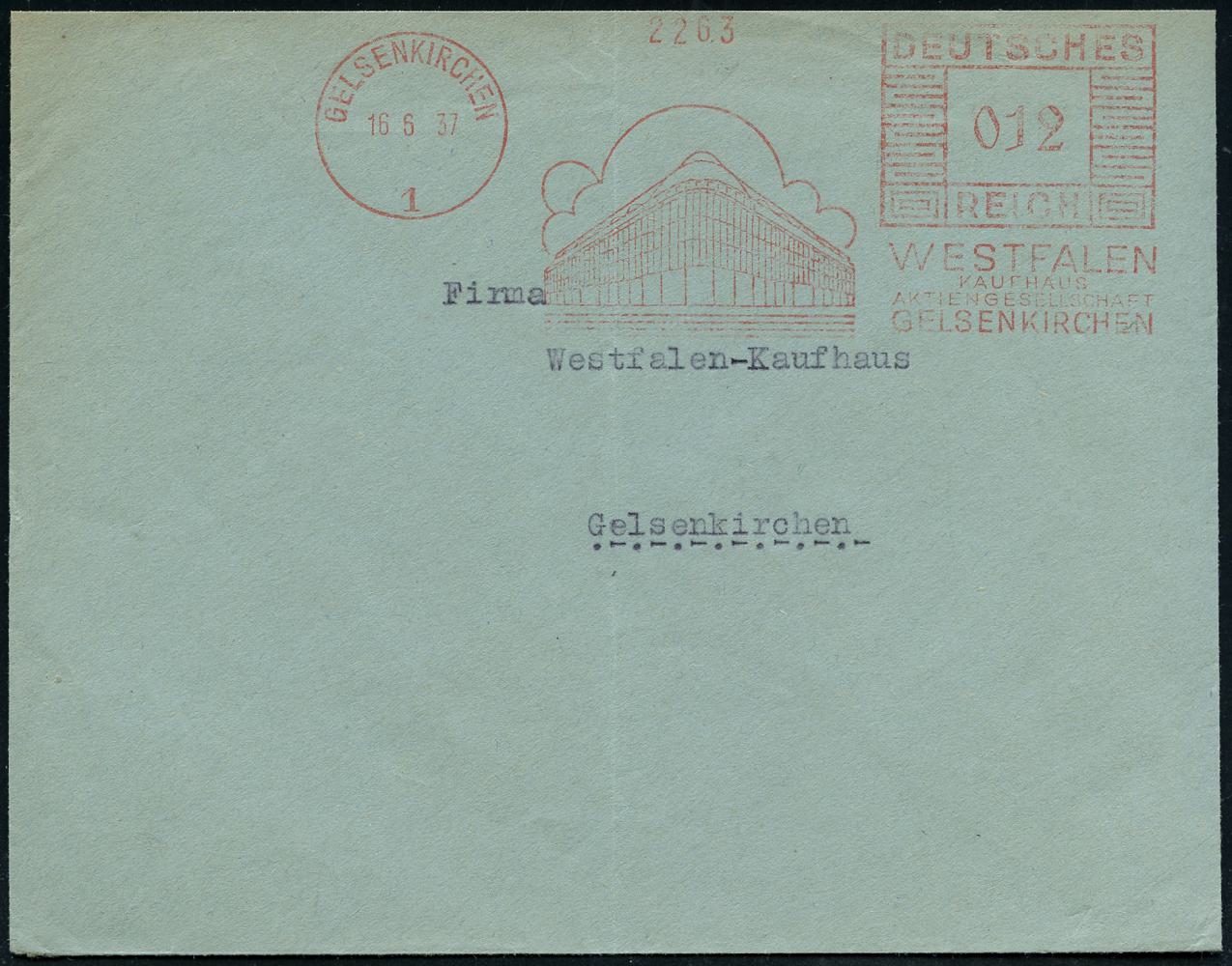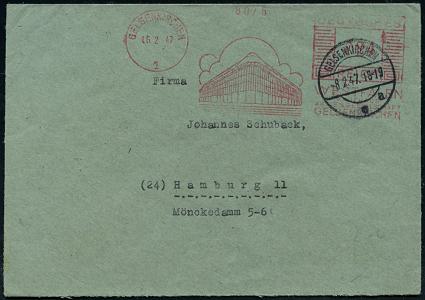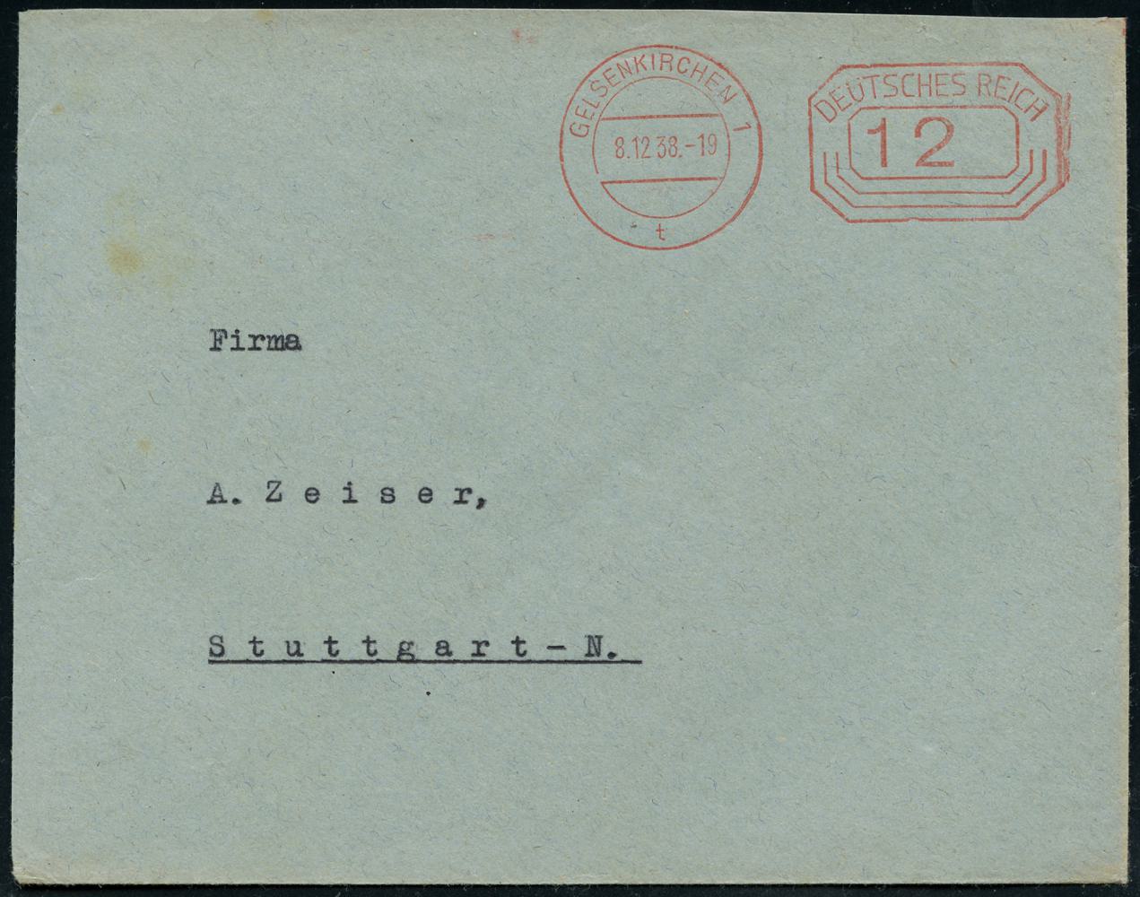 8243 | 18 € | 4650 Gelsenkirchen Post- u. Absender-Freistempel : GELSENKIRCHEN/ 1/ WESTFALEN/ KAUFHAUS/ AG.. 1937 (16.6.) AFS Francotyp "Mäanderrechteck" (Kaufhaus) Orts-Bf. (schwache Mittelfalte), vergl. Kat.-Nr.8251 (Dü.E-2CEh) | ![]() | |