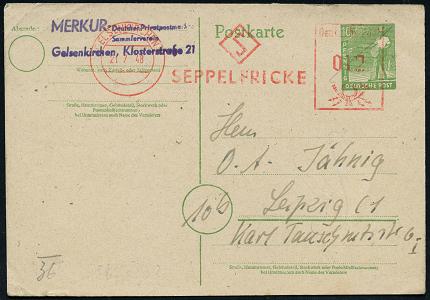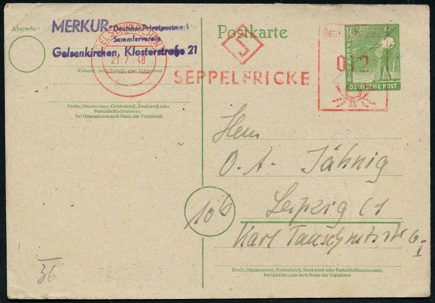 8251 | 20 € | 4650 Gelsenkirchen Post- u. Absender-Freistempel : GELSENKIRCHEN 1/ S/ SEPPELFRICK 1948 (21.7.) AFS Francotyp "Posthorn" 012 Pf. auf Kontrollrat-P 10 Pf. Arbeiter als F o r m b l a t nach der Währungsreform! + Abs.-3L: Merkur, Deutscher Privatpostmarken/ Sammlerverein.. in die SBZ nach Leipzig!, Bedarf (Dü.E-20CG) | ![]() | |