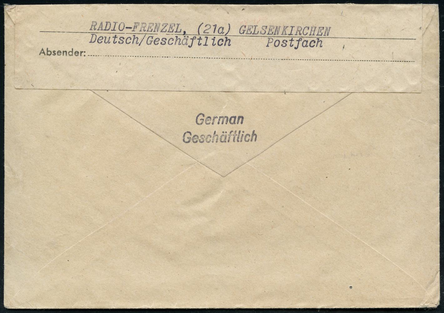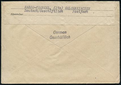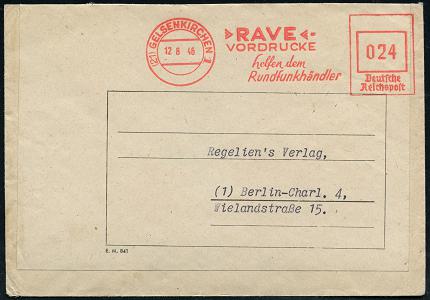 8252 | 25 € | 4650 Gelsenkirchen Post- u. Absender-Freistempel : (21) GELSENKIRCHEN 1/ "RAVE"/ VORDRUCKE/ helfen dem/ Rundfunkhändler 1946 (12.8.) aptierter AFS Francotyp "Reichsadler" = entfernt = Notmaßnahme! , rs. Abs., Recycling-Fern-Bf. n. West-Berlin (Dü.E-13 J-129o) | ![]() ![]() | |