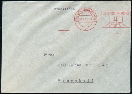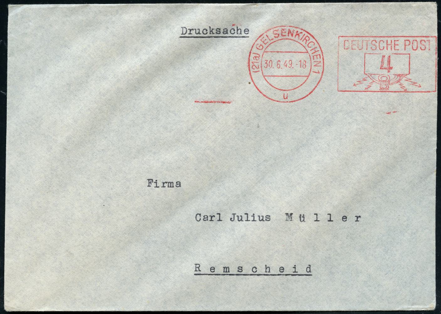8253 | 8 € | 4650 Gelsenkirchen Post- u. Absender-Freistempel : (21a) GELSENKIRCHEN 1/ u/ DEUTSCHE POST 1949 (30.6.) PFS Querrechteck "Posthorn" 4 Pf. , klar gest. Inl.-Drs.-Bf. (Dü.D-15, Nr.269) | ![]() | |