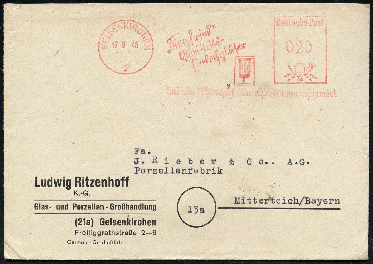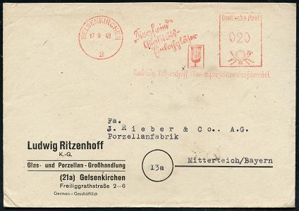 8254 | 18 € | 4650 Gelsenkirchen Post- u. Absender-Freistempel : GELSENKIRCHEN/ 2/ "Siegfried"../ Einmachgläser/ Ludwig Ritzenhoff, Glas-u.Porzellan-Großhandel 1948 (17.9.) AFS Francotyp "Posthorn", Text teils "Sütterlin" (Logo: stilis. Trinkglas) Firmen-Fern-Bf. (Dü.E-20CE) | ![]() | |