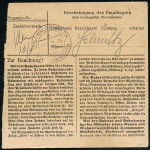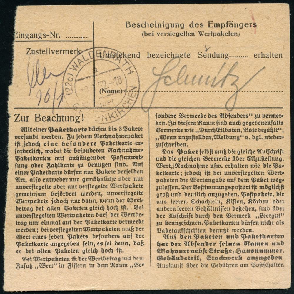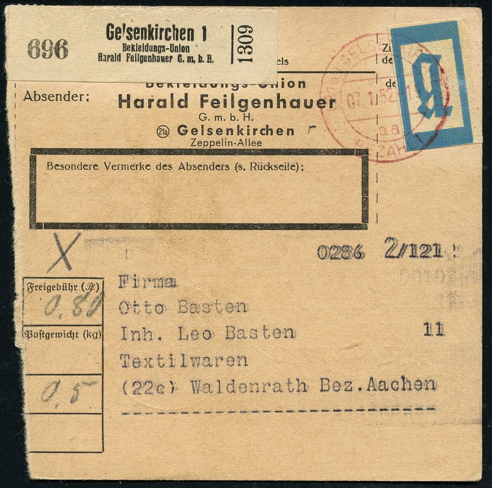 8255 | 18 € | 4650 Gelsenkirchen Post- u. Absender-Freistempel : (21a) GELSENKIRCHEN/ BEZAHLT/ aa 1952 (7.1.) 2K-Steg-PFS auf blauem Label "B" = Beutelstück + schw. Selbstbucher-Paketzettel: Gelsenkirchen 1/ Bekleidungs-Union/ Harals Feilgenhauer GmbH , Inl.-Selbstbucher-Paketkarte n. Waldenrath, rs. AS. (Dü.A-7, Nr.32) | ![]() ![]() | |