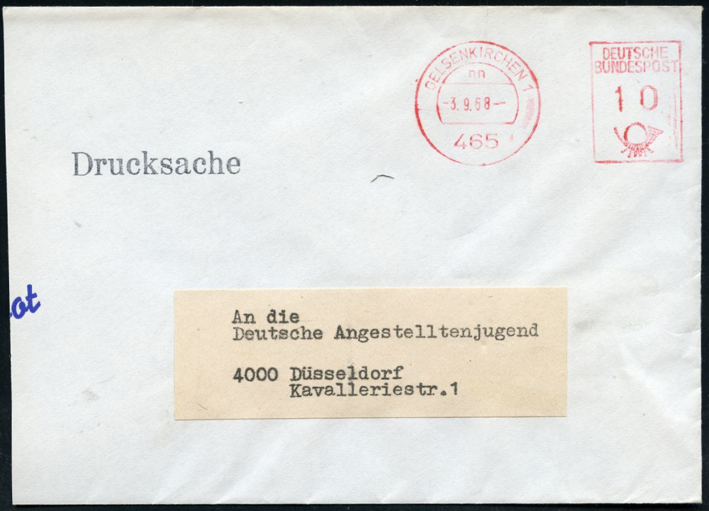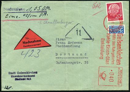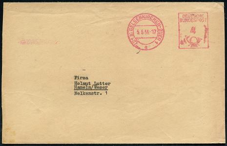 8258 | 20 € | 4650 Gelsenkirchen Post- u. Absender-Freistempel : (21a) GELSENKIRCHEN 1/ Gelsenkirchen/ ..Kohle-Eisen-Glas/ Bekleidung 1954 (3.8.) AFS Francotyp 040 Pf. auf 2 Pf. NoB + 20 Pf. Heuss I = Vorausentwertung + Dreiecksstempel "11" (Bf. Mittelfalte) Fern-NN-Dienst-Bf. n. Dortmund, seltene Verwendung! (Dü.E-23DG + Mi.185) | ![]() | |