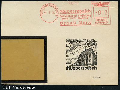 8244 | 18 € | 4650 Gelsenkirchen Post- u. Absender-Freistempel : GELSENKIRCHEN 1/ Küppersbusch/ Jnternat.Ausstellung/ Paris 1937, Klasse 36/ Grand Prix 1939 (31.8.) seltener AFS Francotyp "Reichsadler" zur Expo Paris 1937 auf Firmen-Teil-Vorderseite (Dü.E-5DGo) | ![]() | |