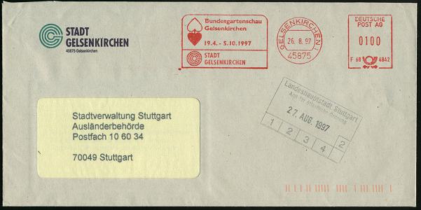 8262 | 10 € | 4650 Gelsenkirchen Post- u. Absender-Freistempel : 45875 GELSENKIRCHEN 1/ F68 4842/ Bundesgartenschau/ ..19.4.-5.10. 1997 (26.8.) AFS Postalia "DEUTSCHE POST AG" mit Kennung (Buga-Logo, Stadtlogo) Kommunal-Bf. (Dü.E-26B) | ![]() | |