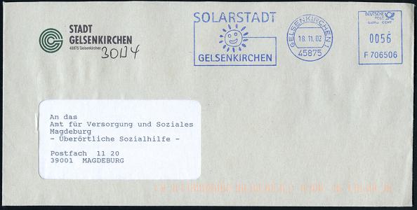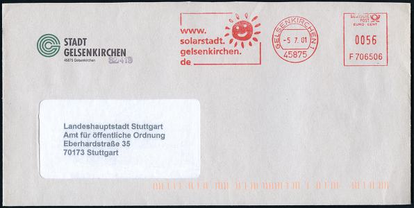 8263 | 12 € | 4650 Gelsenkirchen Post- u. Absender-Freistempel : 45875 GELSENKIRCHEN 1/ F 706506/ www./ solarstadt.. 2001/02 AFS Postalia mit Kennung in EURO-Cent, je rot bzw. blau: je Sonne (Einzelverkauf möglich: je 7.- EUR) 2 Kommunal-Briefe | ![]() ![]() | |