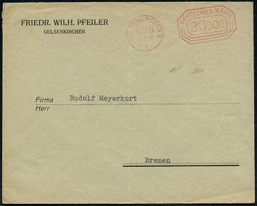 8237 | 20 € | 4650 Gelsenkirchen Post- u. Absender-Freistempel : GELSENKIRCHEN 1/ I/ DEUTSCHES REICH 1923 (30.8.) Infla-PFS "Achteck" 20ooo (Mark) Firmen-Bf.: FRIEDR. WILH. PFEILER.. (schwache Mittelfalte) n. Bremen (Dü.D-3, Nr.90) | ![]() | |
