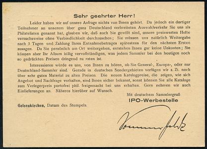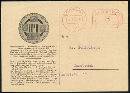 8241 | 16 € | 4650 Gelsenkirchen Post- u. Absender-Freistempel : GELSENKIRCHEN 1/ t/ DEUTSCHES REICH 1935 (28.9.) PFS "Achteck" auf Reklame-Kt.: IPO INTERNATIONALER POSTWERTZEICHEN SAMMLERVEREIN (diverse Briefmarken) rs. Werbetext (Dü.D-4) | ![]() ![]() | |