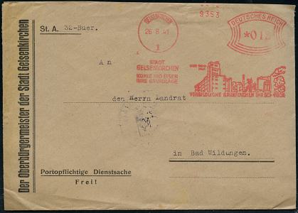 8245 | 25 € | 4650 Gelsenkirchen Post- u. Absender-Freistempel : GELSENKIRCHEN/ 1/ STADT/ GELSENKIRCHEN/ KOHLE U.EISEN/ ..HANS SACHS-/ HAUS.. 1941 (26.8.) AFS Francotyp "Bogenrechteck" (Stadtbild mit Hans-Sachs-Haus, Hans Sachs = Dürer-Zeitgenosse, von Rich. Wagner in "Meistersinger" gewürdigt) Dienst-Bf.: Der Oberbürgermeister.., rs. viol. Dienstsiegel-HdN vergl. Kat.-Nr.8542 (Dü.E-1Ah) | ![]() ![]() | |