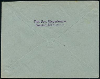8246 | 18 € | 4650 Gelsenkirchen Post- u. Absender-Freistempel : GELSENKIRCHEN 1/ t/ DEUTSCHES REICH 1938 (8.12.) PFS "Achteck" 12 Pf. = Briefporto!+ rs. viol. 2L: Nat. Soz. Fliegerkorps/ Standort Gelsenkirchen (= paramilitärische NS-Organisation) Fern-Bf. (Dü.D-4) | ![]() ![]() | |