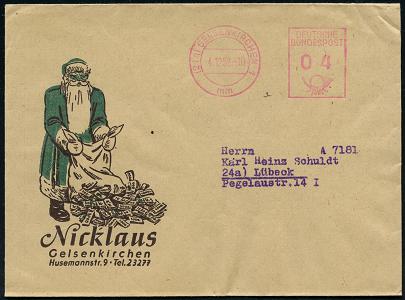 8256 | 12 € | 4650 Gelsenkirchen Post- u. Absender-Freistempel : (21a) GELSENKIRCHEN 1mm/ DEUTSCHE/ BUNDESPOST 1952 (4.12.) PFS Hochrechteck "Posthorn" 04 Pf. auf Reklame-Bf.: Nicklaus.. (Nikolaus mit Geldsack) (Dü.D-17) | ![]() | |