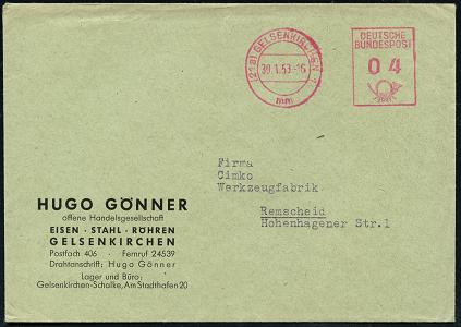 8257 | 8 € | 4650 Gelsenkirchen Post- u. Absender-Freistempel : (21a) GELSENKIRCHEN 1/ mm/ DEUTSCHE/ BUNDESPOST 1953 (30.1.) PFS Hochrechteck "Posthorn" auf Firmen-Bf.: HUGO GÖNNER.. EISEN - STAHL - RÖHREN.. (Dü.D-17) | ![]() | |