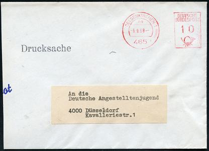 8260 | 6 € | 4650 Gelsenkirchen Post- u. Absender-Freistempel : 465 GELSENKIRCHEN 1/ nn/ DEUTSCHE/ BUNDESPOST 1968 (3.9.) PFS Hochrechteck "Posthorn" mit neuer PLZ ohne Uhrzeit , links verkürzter Inl.-Drs.-Bf. (Dü.D-17) | ![]() | |