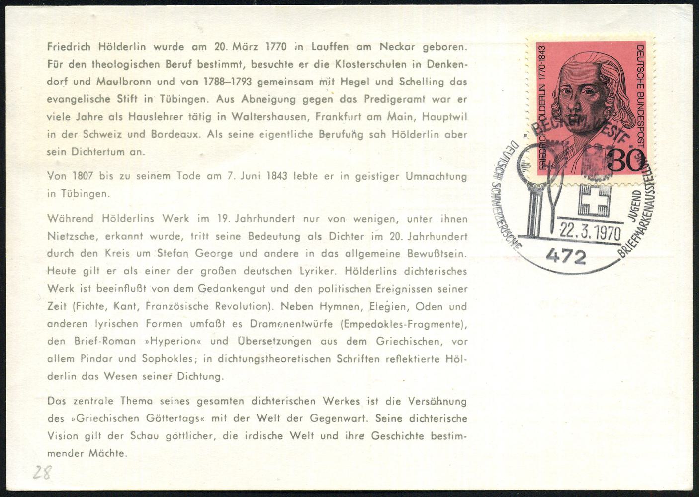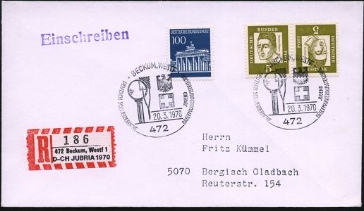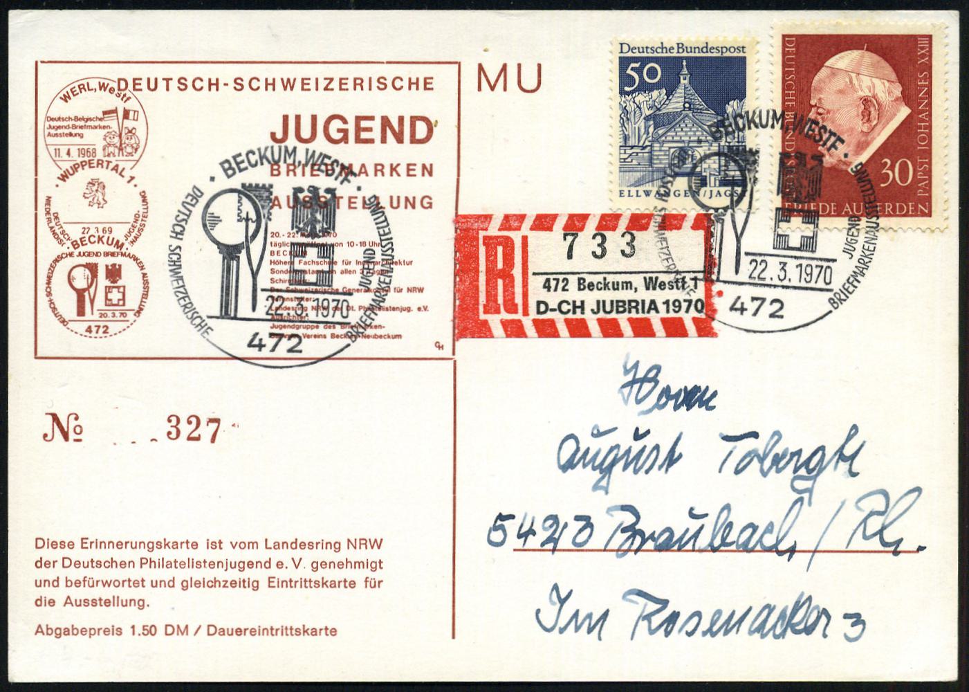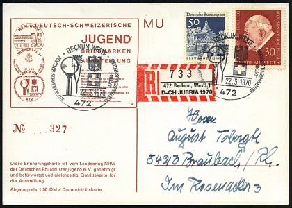 8299 | 25 € | PL-Raum 47.. (ohne Hamm) : 472 BECKUM,WESTF/ DEUTSCH SCHWEIZERISCHE/ JUGEND/ BRIEFM.-AUSSTELLUNG 1970 (21.3.) SSt = Lupe, Pin-zette (u. Wappen) + Sonder-RZ: 472 Beckum, West 1/D-CH JUBRIA 1970 (NEZ.Kat.Nr.1), Ausstungs-R-Sonder-Kt.!, R-Karten sind relativ selten! (Bo.3) | ![]() ![]() | |