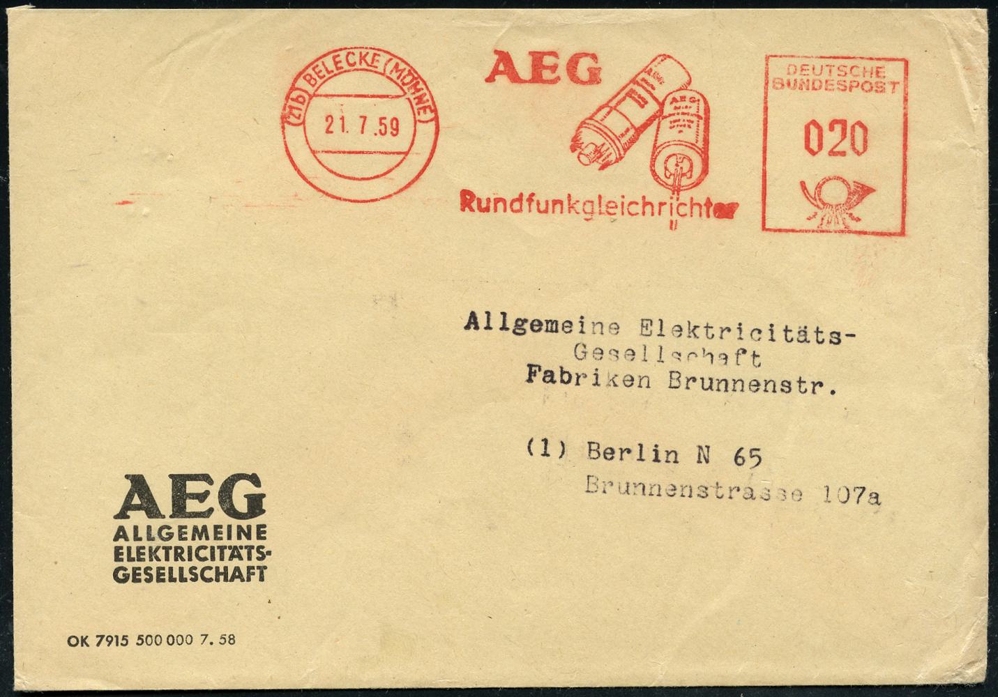 8304 | 15 € | PL-Raum 47.. (ohne Hamm) : (21b) BELECKE (MÖHNE)/ AEG/ Rundfunkgleichrichter 1958 (3.4.) dekorativer AFS Francotyp = 2 AEG-Radio-Gleichrichter , AEG-Firmen.Bf.,, schönes u. seltenes Motiv! (Dü.E-23CG) | ![]() | |