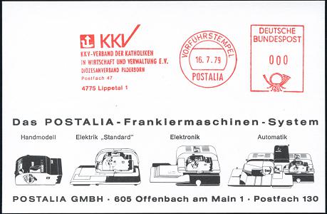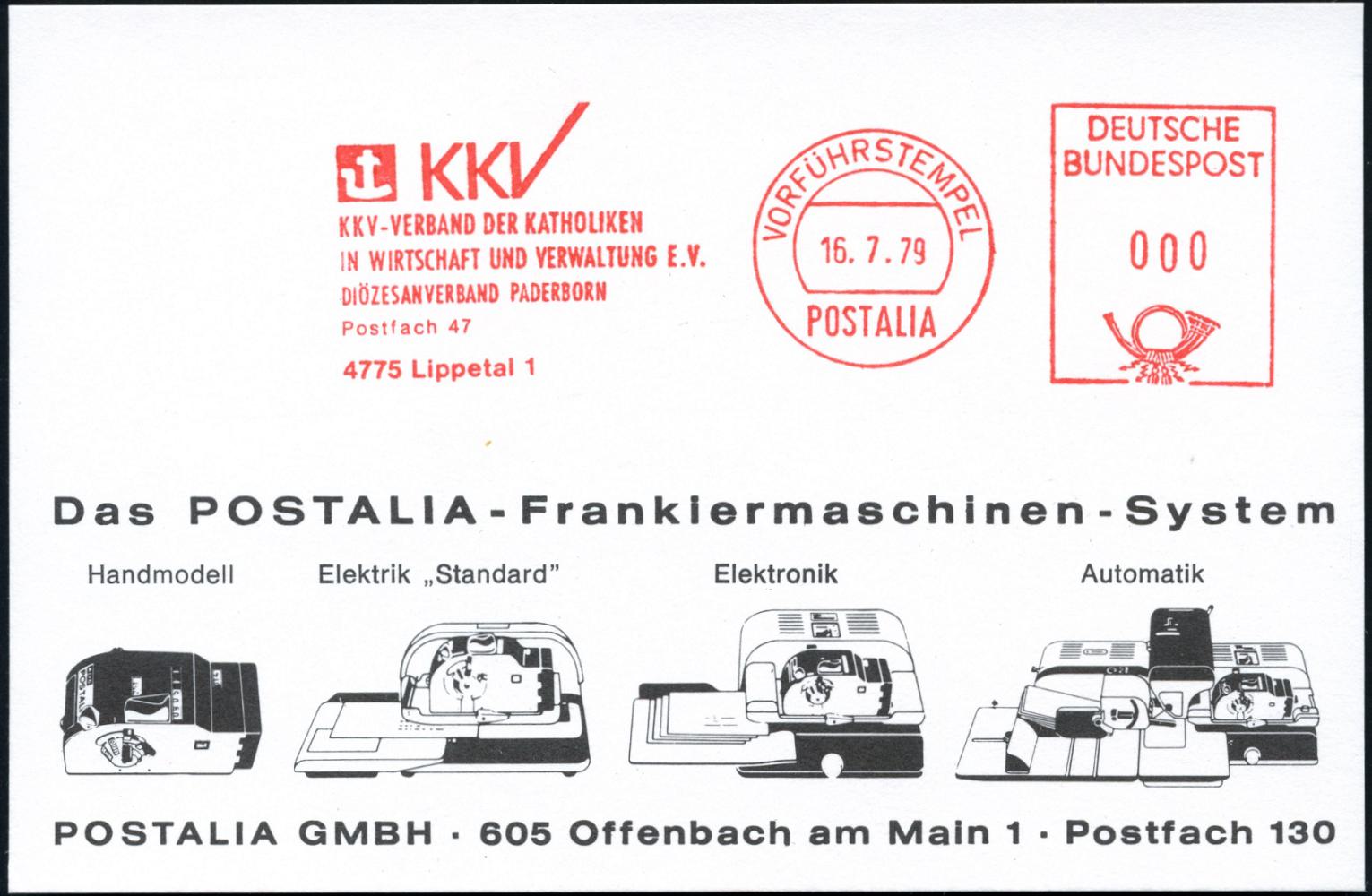8317 | 18 € | PL-Raum 47.. (ohne Hamm) : 4775 Lippetal 1 1979 (16.7.) AFS: VORFÜHRSTEMPEL/POSTALIA/KKV-VERBAND DER KATHOLIKEN (Kreuz-Logo), seltene Postalia-Musterkt.! (= Spezimen) | ![]() | |