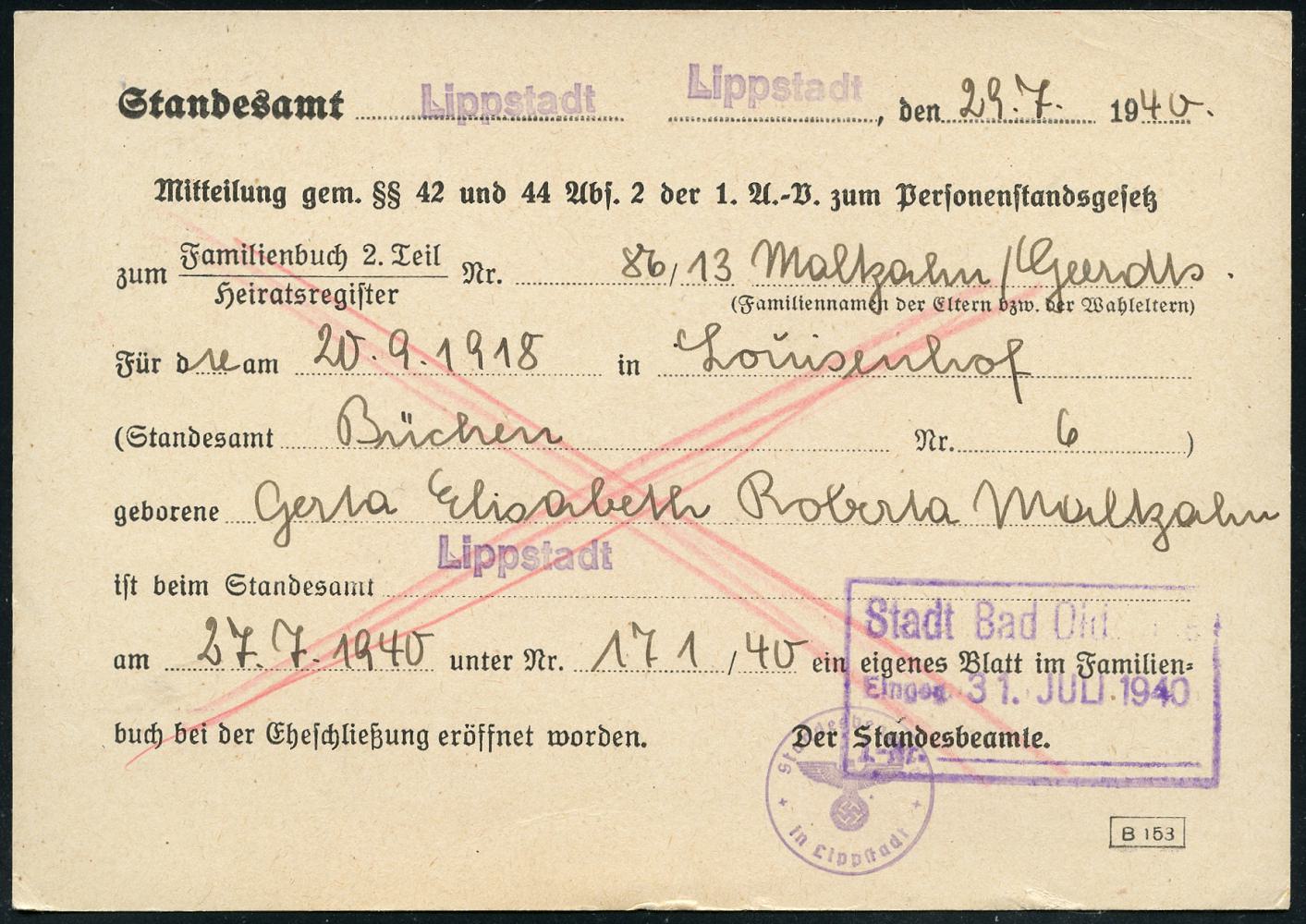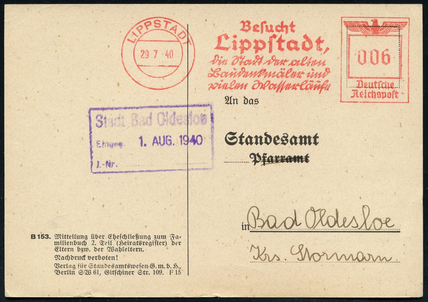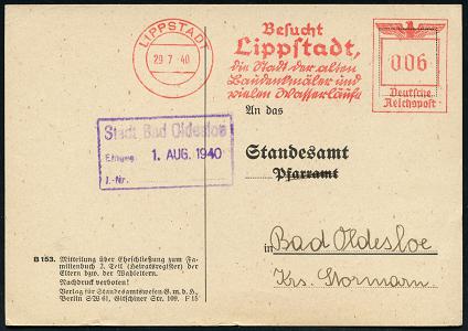 8323 | 18 € | PL-Raum 47.. (ohne Hamm) : LIPPSTADT/ Besucht/ Lippstadt,/ die Stadt der alten/ Baudenkmäler u./ vielen Wasserläufe 1940 (29.7.) AFS Francotyp "Reichsadler", Text teils Sütterlin , klar gest. Kommunal-Kt. "Standesamt" n. Bad Oldesloe, rs. Eingangs-Stpl. (Dü.E-5CGo) | ![]() ![]() | |