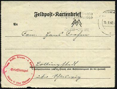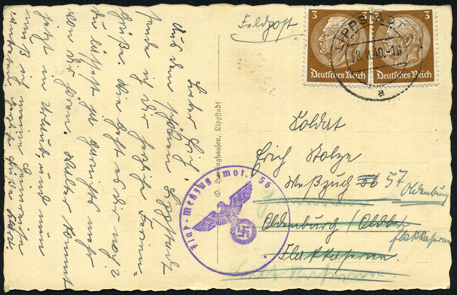 8324 | 18 € | PL-Raum 47.. (ohne Hamm) : LIPPSTADT/ a 1940 (18.8.) 2K-Steg auf 2x 3 Pf. Hindenburg + viol. 1K-HdN: Flak - M e ß z u g (mot.) 56 als Ank.-Stpl. , nachgesandte, frankierte s/w.-Feldpost-Ak. (Marine-Denkmal) an Flak-Meßzug 56 bzw. 57 in Oldenbg. | ![]() ![]() | |