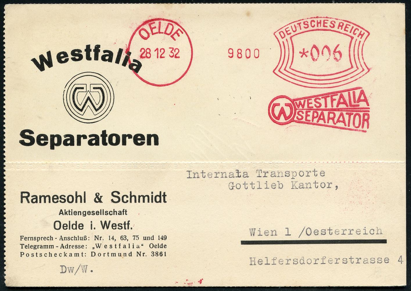 8337 | 25 € | PL-Raum 47.. (ohne Hamm) : OELDE/ WESTFALIA/ SEPARATOR 1932 (28.12.) AFS Francotyp "Bogenrechteck" klar auf Firmen-Kt: Ramesohl & Schmidt AG = Fa. für techn.Separatoren für Medizin, Chemie, Agrarwirtschaft, Ausl.-Karte n. Wien = Inl.-Tarif ! (Dü.E-1Am) | ![]() | |