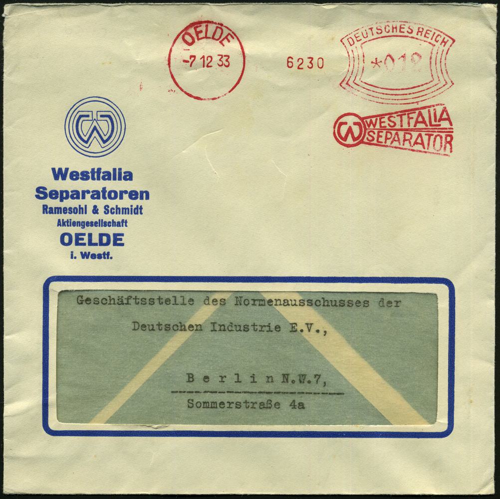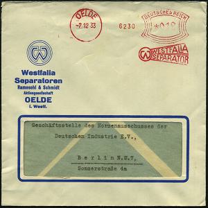 8338 | 20 € | PL-Raum 47.. (ohne Hamm) : OELDE/ WESTFALIA/ SEPARATOR 1933 (7.12.) AFS Francotyp "Bogenrechteck" (Monogr.-Logo) motivgl. Firmenbf.: Westfalia Separatoren, Ramesohl & Schidt AG = Firma für techn. Separatoren für Medizin, Chemie, Agrarwirtschaft etc., Fern-Bf. (Dü.E-1Am) | ![]() | |