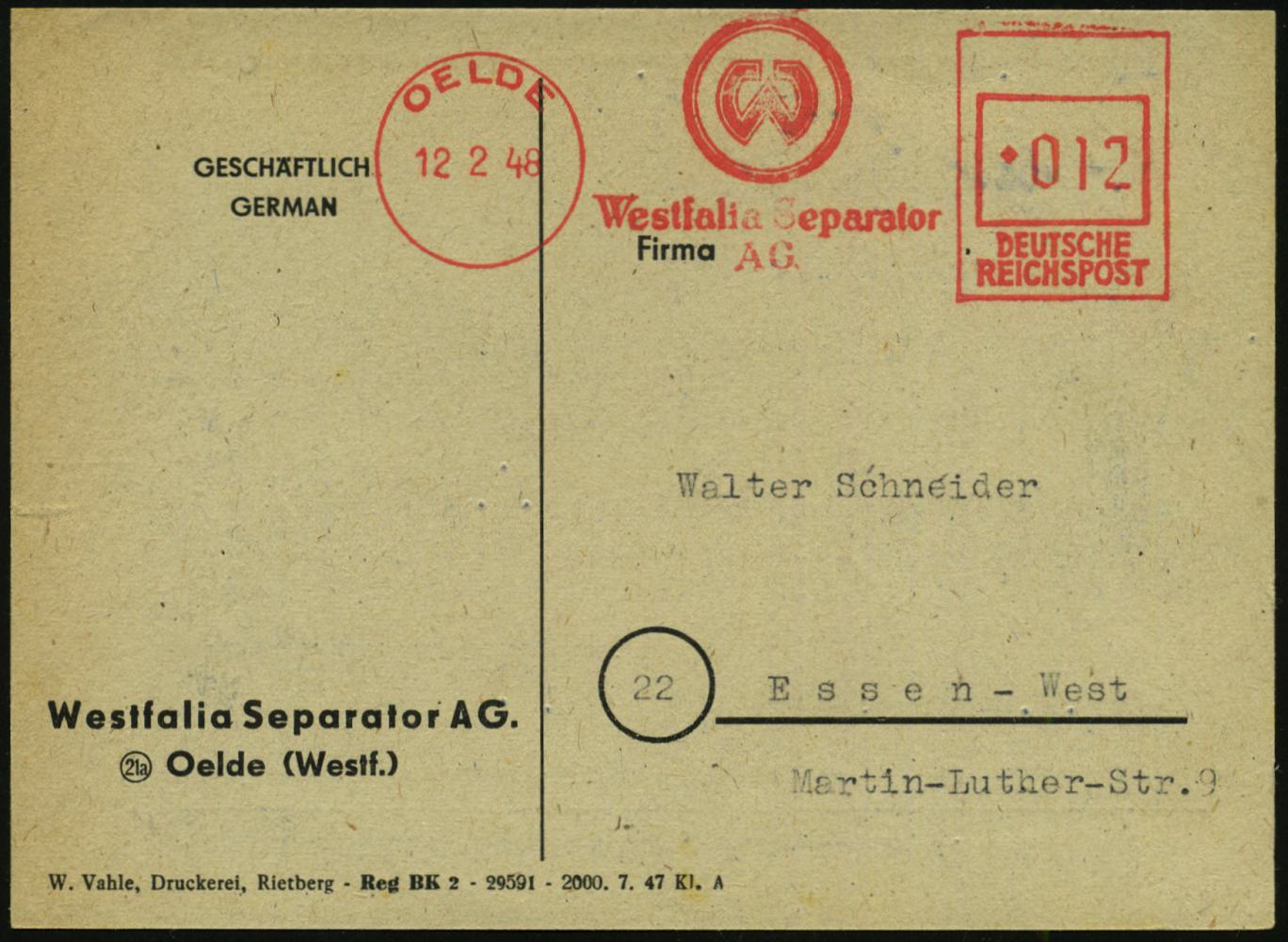 8340 | 25 € | PL-Raum 47.. (ohne Hamm) : OELDE/ Westfalia Separator/ AG. 1948 (12.2.) aptierter AFS Francotyp "Reichsadler" ANTIQUA = NS-Adler entfernt = Notmaßnahme! (Firmen-Monogr.) = Zentrifugen-Hersteller für alle Anwendungsbereiche Medizin, Chemie u. Landwirtschaft etc., seltene Firmen-Kt. n. Essen (Dü-14 C-231o) | ![]() | |