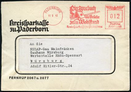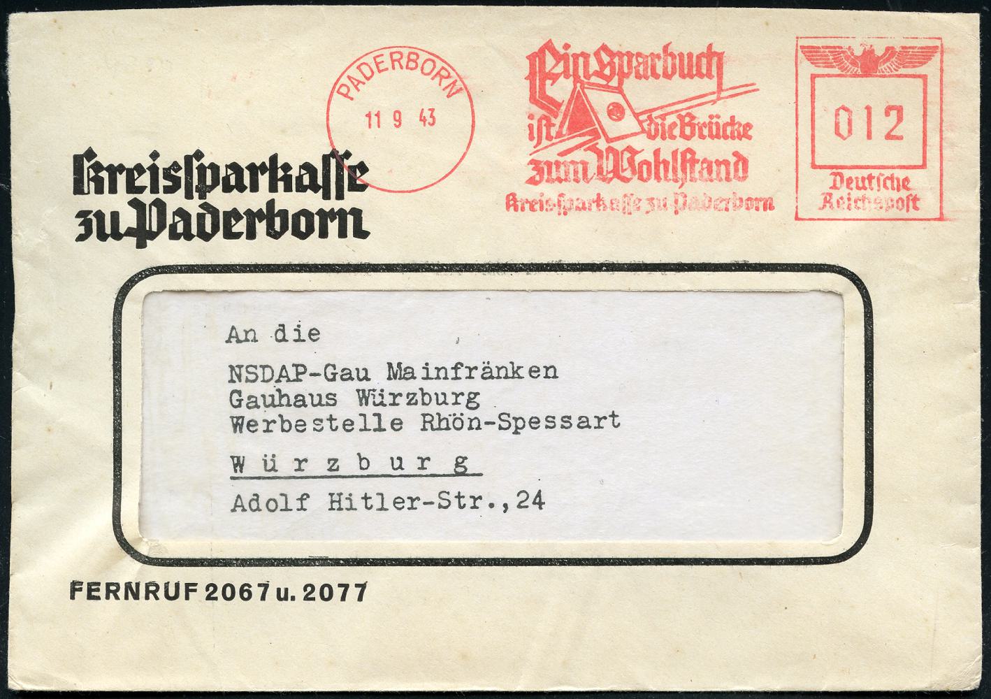 8342 | 20 € | PL-Raum 47.. (ohne Hamm) : PADERBORN/ Ein Sparbuch/ ist die Brücke/ zum Wohlstand/ Kreissparkasse.. 1939 (16.10.) AFS Francotyp "Reichsadler" (Sparbuch als Schutzdach) klar auf Firmen-Kt. (Dü.E-5CEo) | ![]() | |
