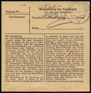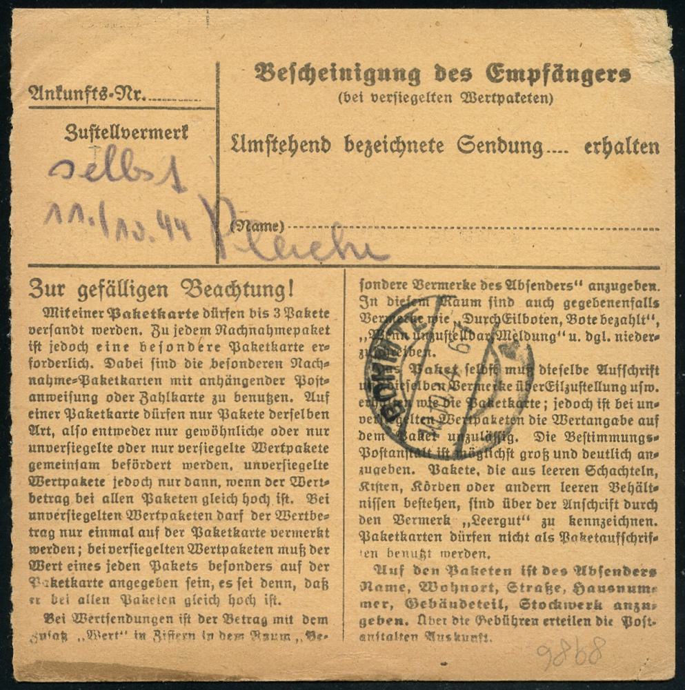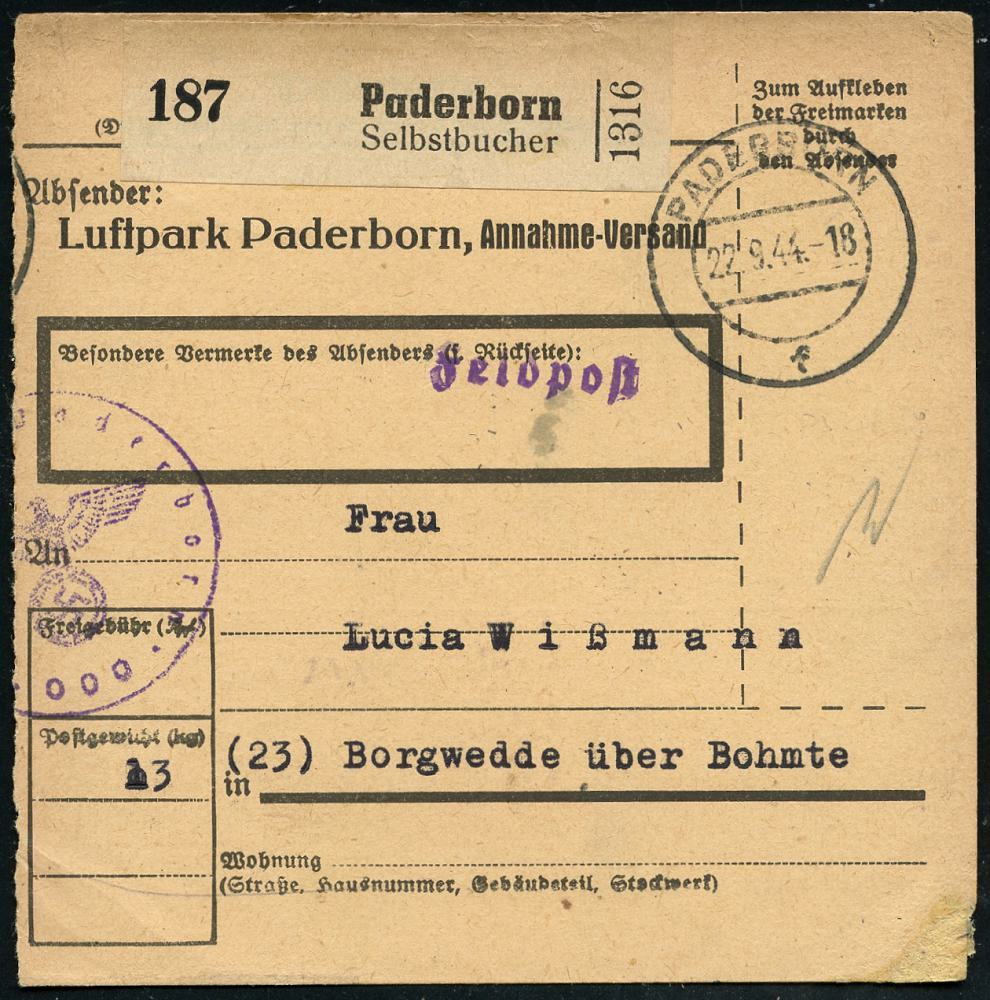 8343 | 28 € | PL-Raum 47.. (ohne Hamm) : PADERBORN/ f 1944 (22.9.) 2K-Steg + 1L: Feldpost + Wehrmachts-Selbstbucher-Paketzettel: Paderborn/ Selbstbucher , Selbstbucher-Feldpost-Paket-Kt. mit Vordruck: Luftpark Paderborn.. n. Bohmte, rs. AS. | ![]() ![]() | |