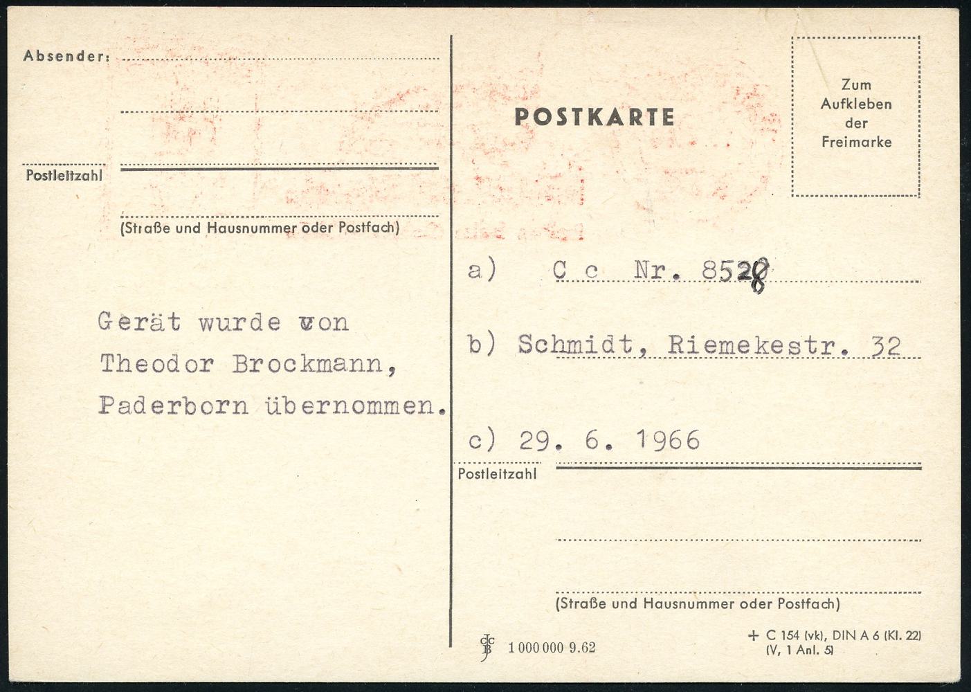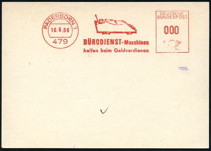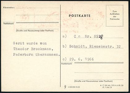8349 | 20 € | PL-Raum 47.. (ohne Hamm) : 479 PADERBORN 1/ BÜRODIENST-Maschinen/ helfen beim Geldverdienen 1966 (16.6.) AFS Francotyp (Schreibmaschine) auf postamtl. Archivkarte, rs. Vermerk "Gerät wurde von Theordor Brockmann übernommen.." (rs. div. postamtl. Vermerke) inkl. Maschinen-Nr. etc., = seltenes Unikat! (Dü.E-23CO) | ![]() ![]() | |