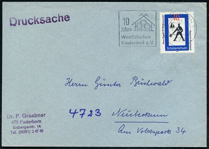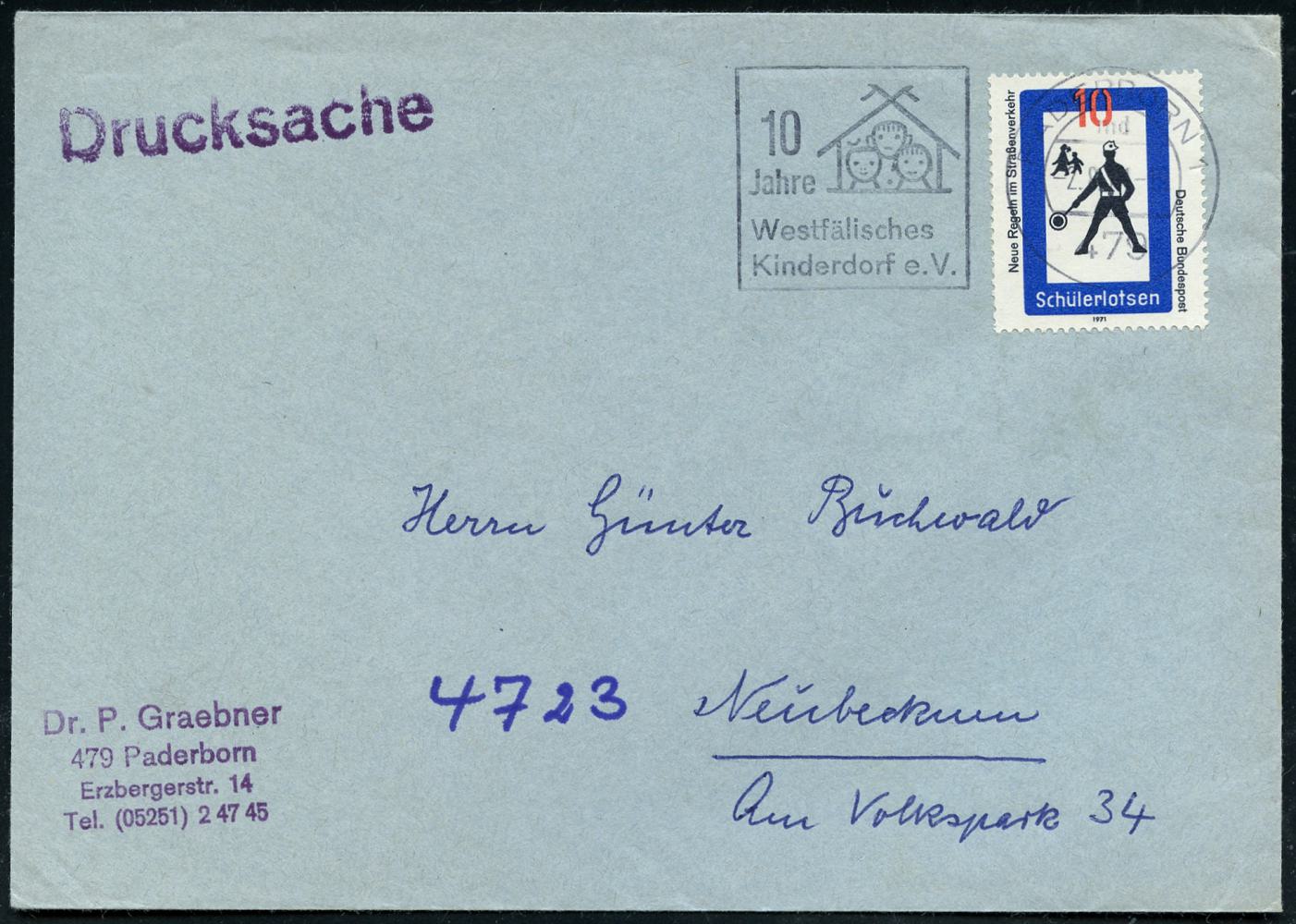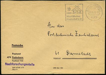 8350 | 16 € | PL-Raum 47.. (ohne Hamm) : 479 PADERBORN 1/ 10 Jahre/ Westfäl./ Kinderdorf e.V. 1971 (31.8.) MWSt (Kinder unter Dach) + viol. 1L: Nachforschungsstelle, Postdienst-Bf. an PTZ Darmstadt (Bo.31 A) | ![]() | |
