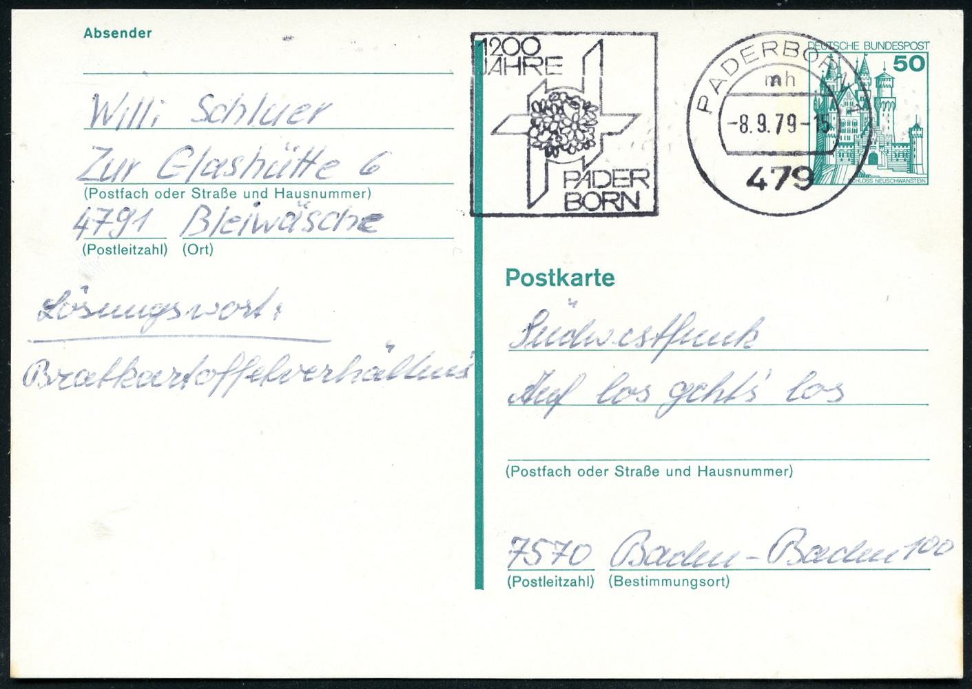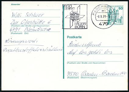 8352 | 6 € | PL-Raum 47.. (ohne Hamm) : 479 PADERBORN 1/ mh/ 1200/ JAHRE 1979 (8.9.) MWSt (Doppelkreuz mit Blumen) Bedarfs-Kt. (Bo.55 A II) | ![]() | |