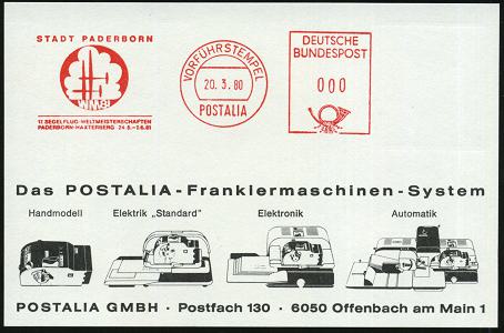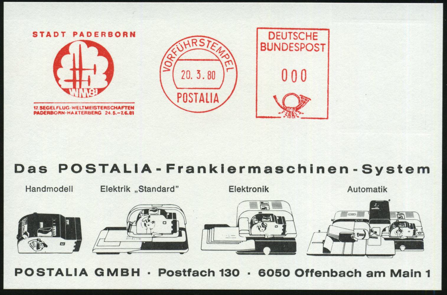 8353 | 18 € | PL-Raum 47.. (ohne Hamm) : Paderborn 1980 (20.3.) AFS.: VORFÜHRSTEMPEL/POSTALIA/STADT PADERBORN/17. SEGELFLUG-WELTMEISTERSCHAFTEN.. (2 Segelflugzeuge = Logo) seltene= Specimen Postalia-Muster-Kt.! | ![]() | |