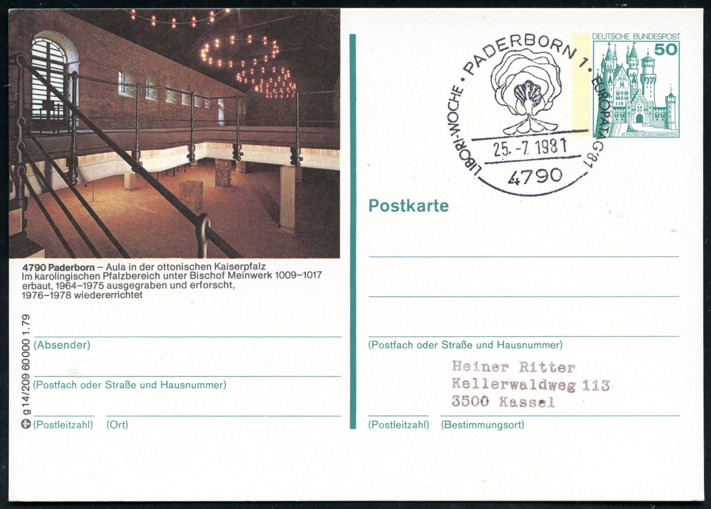 8355 | 14 € | PL-Raum 47.. (ohne Hamm) : 4790 PADERBORN 1/ LIBORI-WOCHE/ EUROPATAG 1981 (25.7.) SSt auf ortsgl. BiP 50 Pf. Burgen: 4790 Paderborn.. Aula der ottonischen Kaiserpfalz (1009-17 erbaut) seltene Kombination! (Bo.72 / Mi.P 129) | ![]() | |