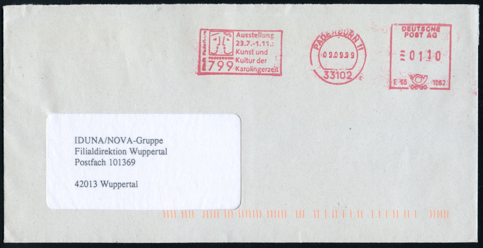 8357 | 12 € | PL-Raum 47.. (ohne Hamm) : 33102 PADERBORN 11/ E65 1062/ Ausstellung../ Kunst u.Kultur der/ Karolingerzeit.. 1999 (9.9.) AFS Pitney-Bowes "DEUTSCHE POST AG" mit Kennung (2 Gesichter) Kommunal-Bf. | ![]() | |