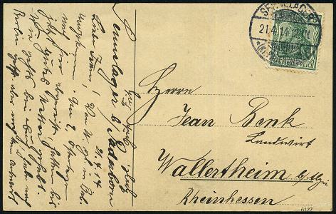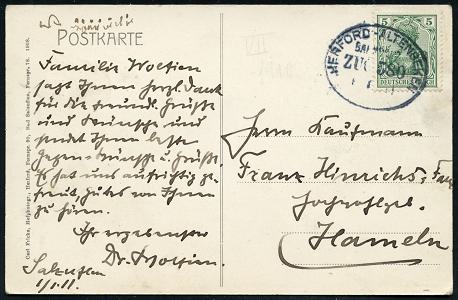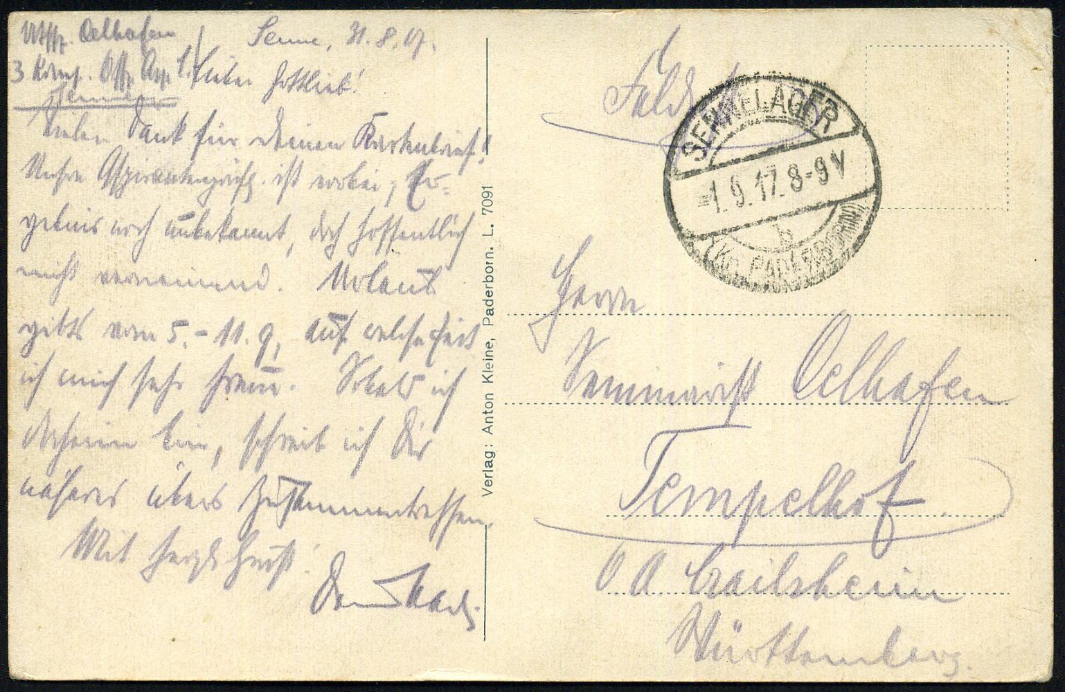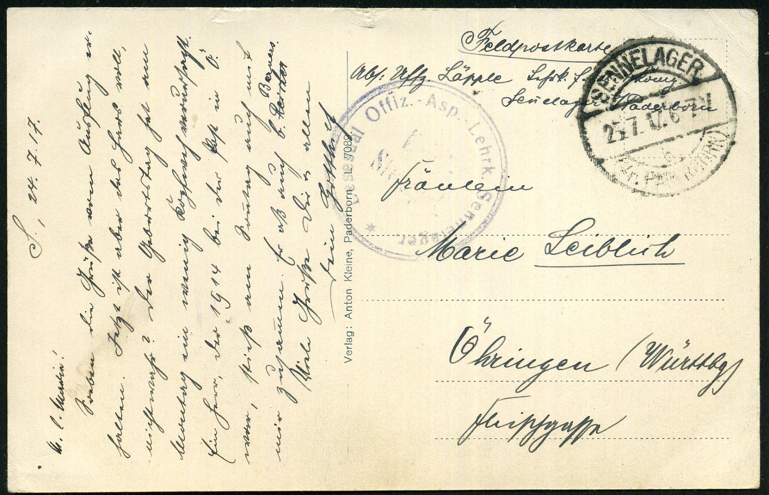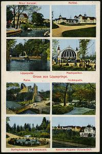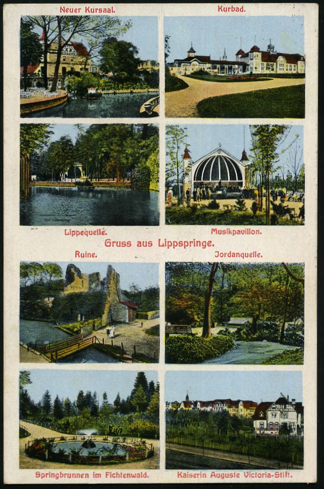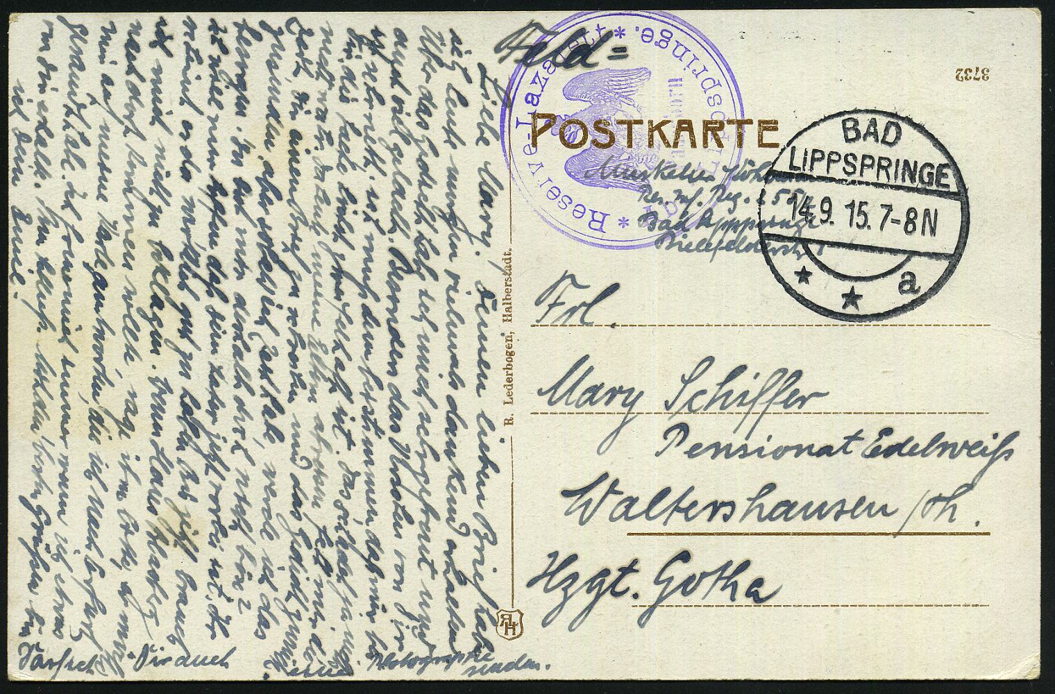 8284 | 15 € | PL-Raum 47.. (ohne Hamm) : BAD/ LIPPSPRINGEN/ **a 1915 (14.9.) 1K-Segment + viol. 2K-HdN: Reserve-Lazarett/ Bad Lippspringen/Paderborn (preuß. Adler) + hs. Abs.: ".. Res. Inf. Reg. 255", Color-Feldpost-Ak.: "Gruss aus Lippspringe.." mit 8 Ansichten n. Waltershausen | ![]() ![]() | |