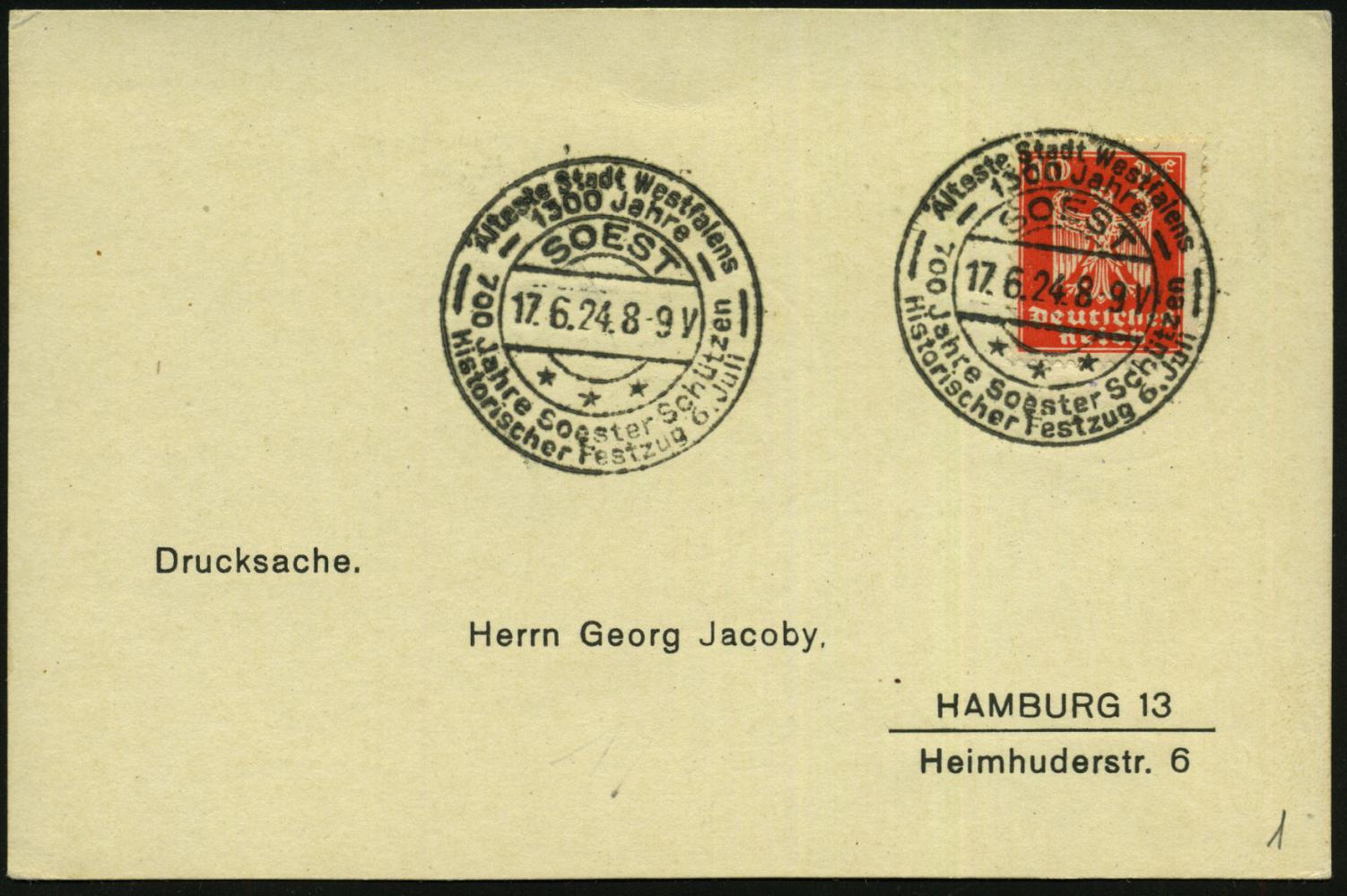 8369 | 20 € | PL-Raum 47.. (ohne Hamm) : SOEST/ ***/ ..1300 Jahre/ 700 Jahre Soester Schützen/ Histor.Festzug 6.Juli 1924 (17.6.) HWSt 2x klar gest. Inl.-Karte (Bo.1) | ![]() | |