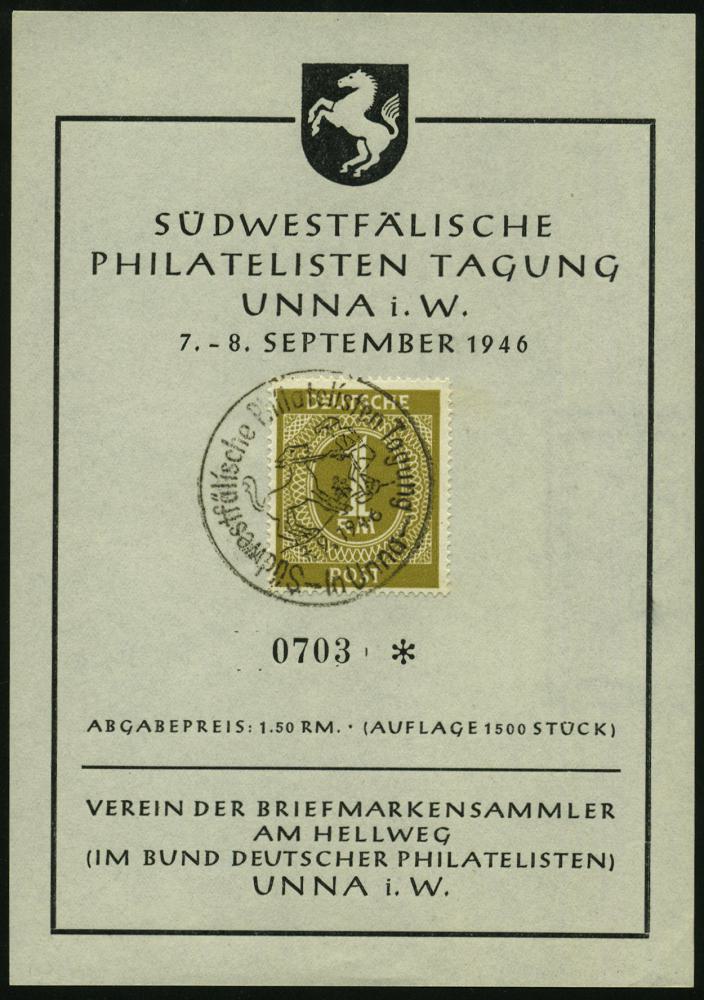 8388 | 20 € | PL-Raum 47.. (ohne Hamm) : Unna/ Südwestfälische Philatelisten Tagung 1946 (7.9.) seltener SSt (Müller mit störrischem Esel) numeriertes Gedenkblatt (Bo.2) | ![]() | |