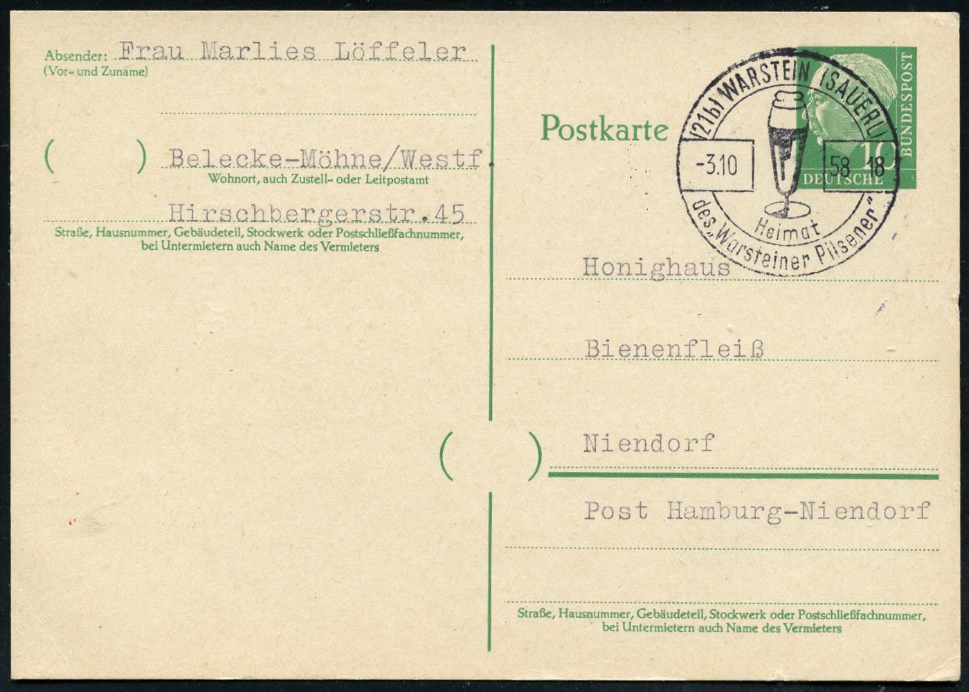 8390 | 12 € | PL-Raum 47.. (ohne Hamm) : (21b) WARSTEIN (SAUERL)/ Heimat/ des "Warsteiner Pilsener" 1958 (3.10.) HWSt = Pils-Glas , klar gest. Bedarfs-Kt. (Bo.3) | ![]() | |