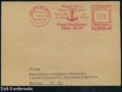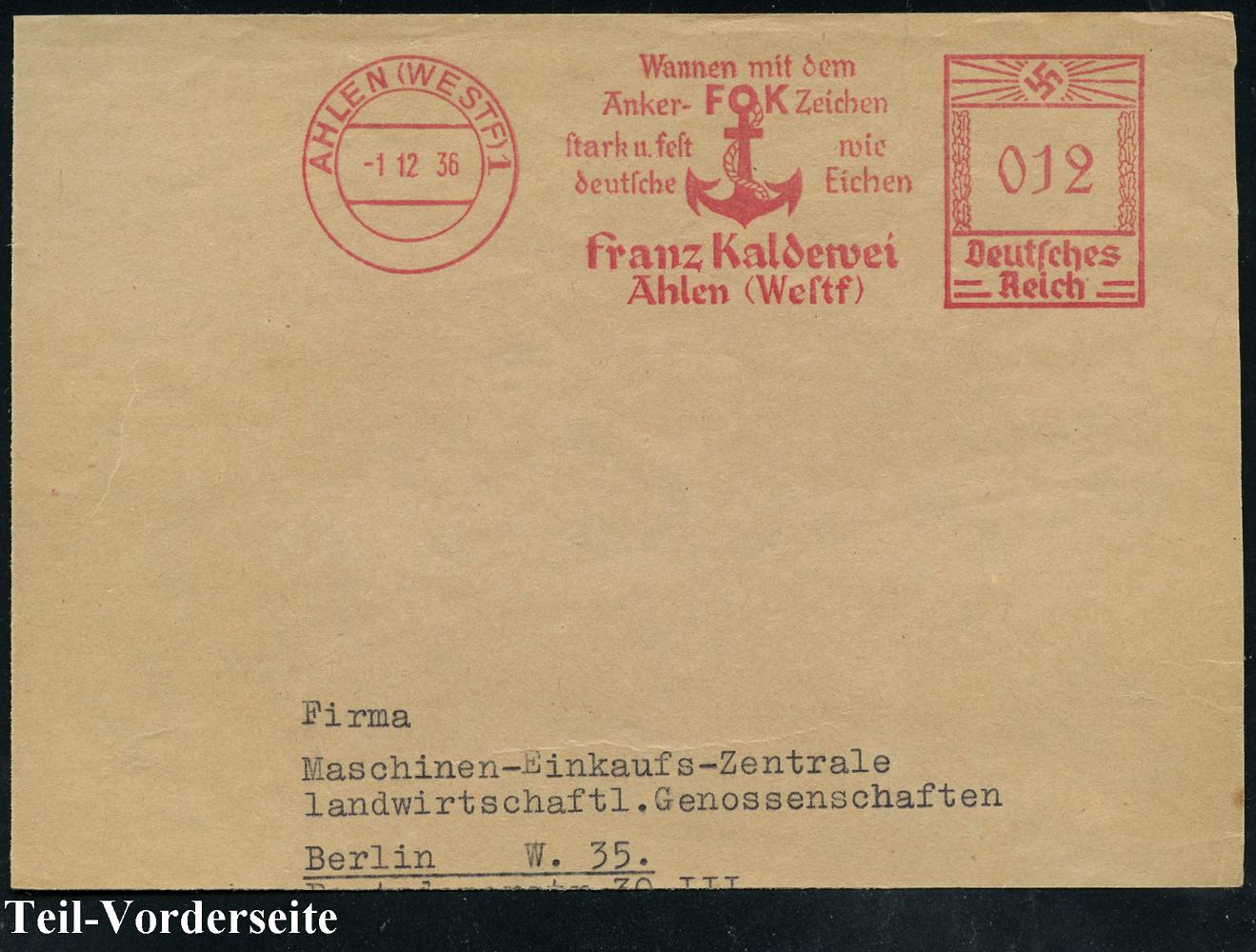 8277 | 15 € | PL-Raum 47.. (ohne Hamm) : AHLEN (WESTF) 1/ Wannen mit dem/ Anker-Zeichen../ Franz Kaldewei.. 1936 (1.12.) AFS Francotyp "Hakenkreuz" (Anker-Logo) klar gest. Teil-Vorderseite (Dü.E-3CEo) | ![]() | |