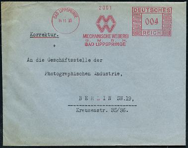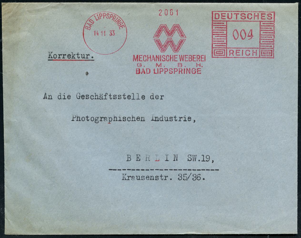 8281 | 20 € | PL-Raum 47.. (ohne Hamm) : BAD LIPPSPRINGE/ MECHANISCHE WEBEREI/ GMBH.. 1933 (14.11.) AFS Francotyp "Mäanderrechteck" (Monogr.-Logo) Fern-Bf. (Dü.E-2CEh) | ![]() | |