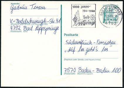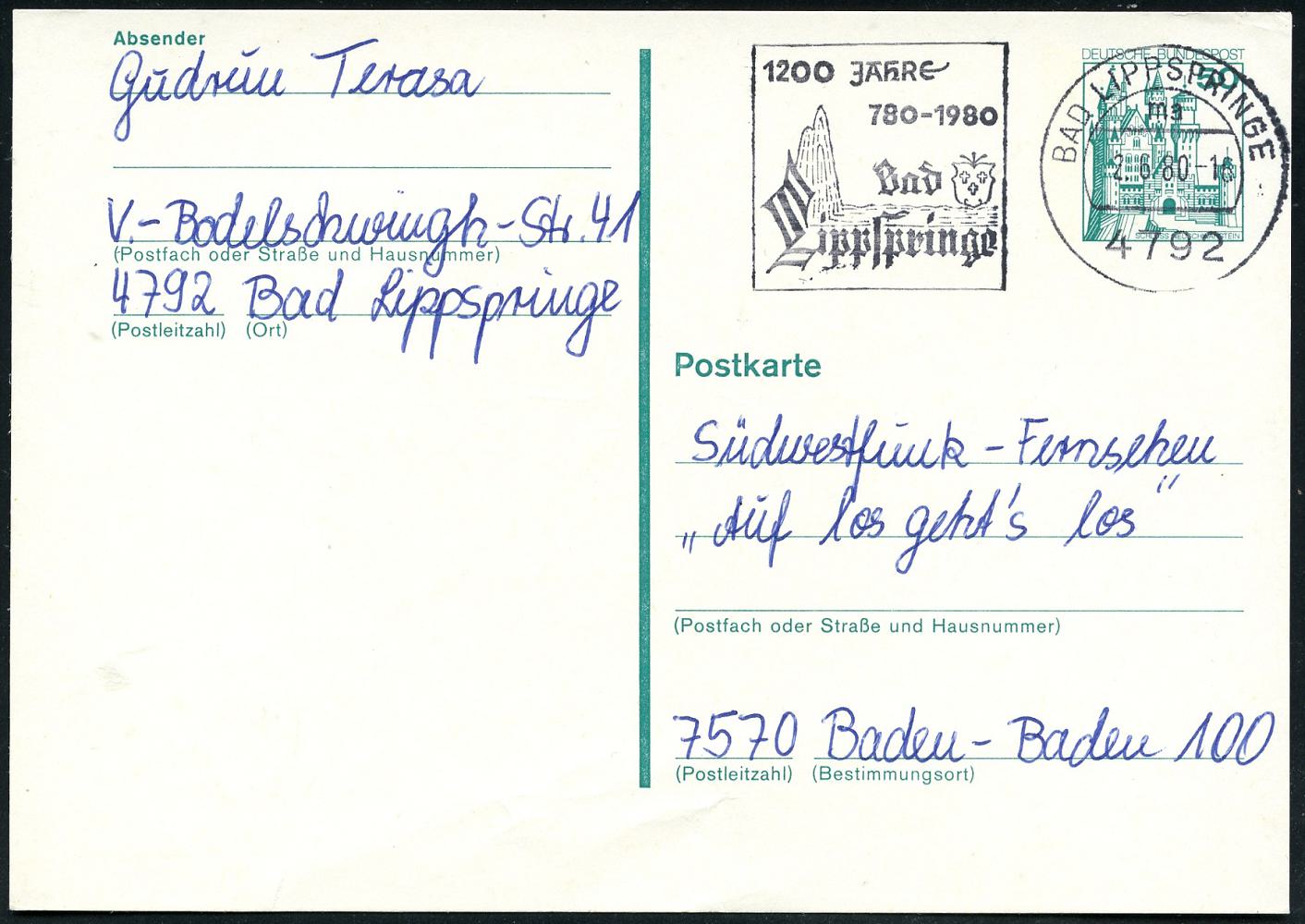 8292 | 6 € | PL-Raum 47.. (ohne Hamm) : 4792 BAD LIPPSPRINGE/ ma/ 1200 JAHRE(780-1980.. 1980 (2.6.) MWSt (Springquell, Wappen) Bedarfs-Kt. | ![]() | |