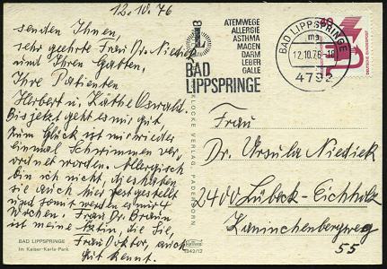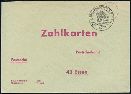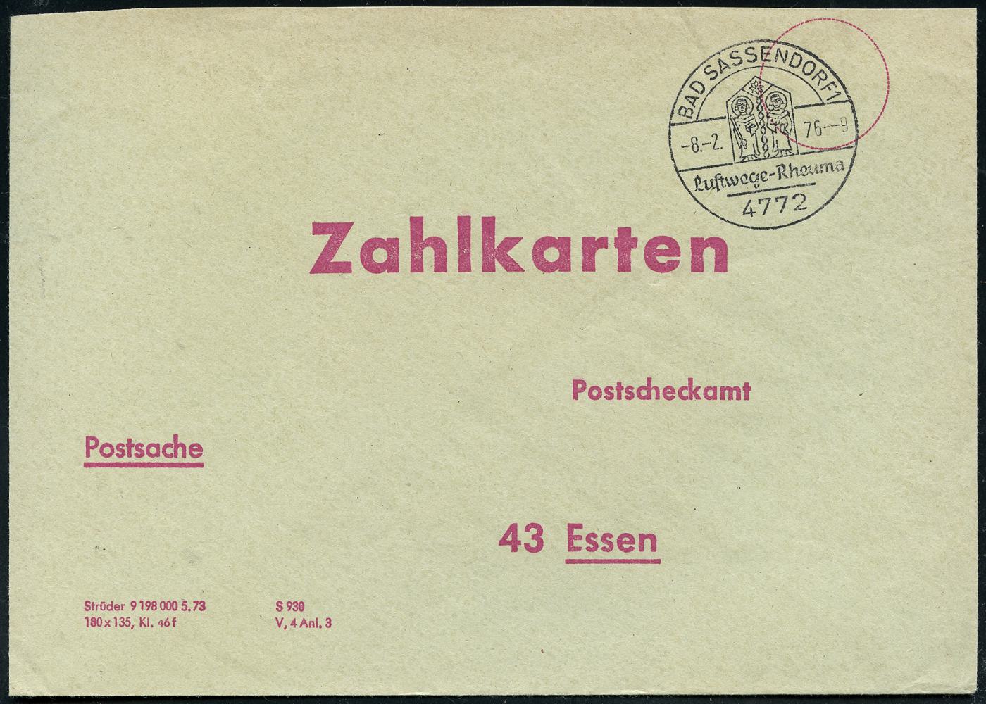 8295 | 18 € | PL-Raum 47.. (ohne Hamm) : 4772 BAD SASSENDORF 1/ Luftwege-Rheuma 1976 (8.2.) HWSt (Schutzheilige St. Simon u. St. Judas Thaddäus) auf Postinnendienst-Bf.: Zahlkarten Postscheckamt.. für internen Zahlkartenaustausch (grün/magenta), seltene Verwendung! (Bo.4 II, nur 1976-77 verwendet) | ![]() | |