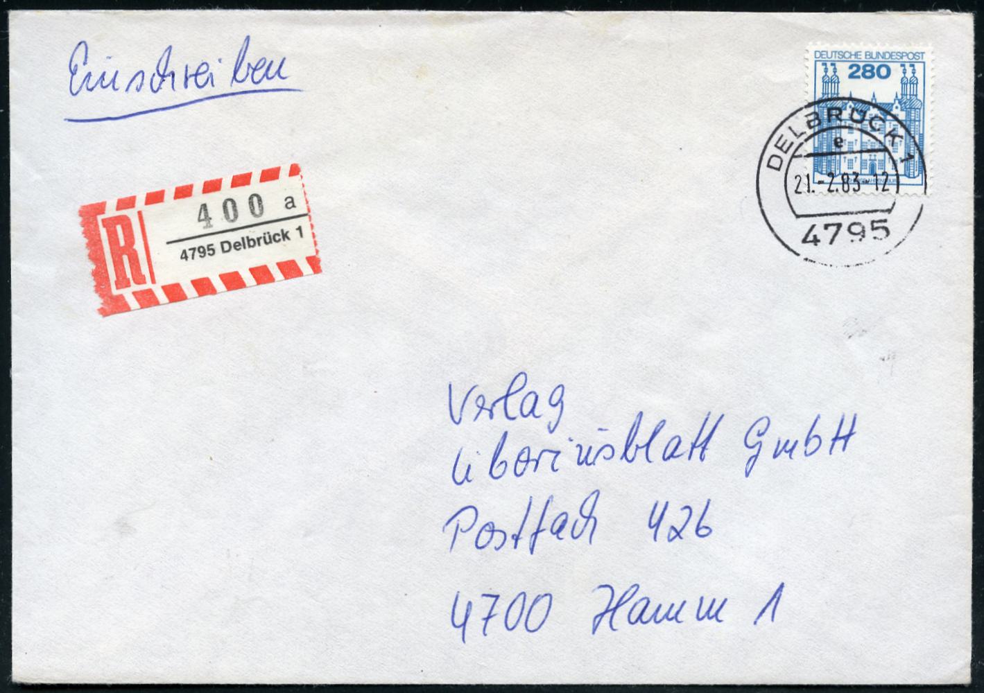 8308 | 10 € | PL-Raum 47.. (ohne Hamm) : 4795 DELBRÜCK 1/ e 1983 (21.2.) 1K-Segment auf EF 280 Pf. Burgen, blau + RZ: 4795 Delbrück 1/a , klar gest. Fern-R-Bf. (Mi.1142 EF) | ![]() | |