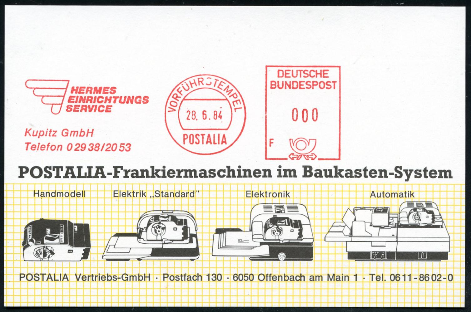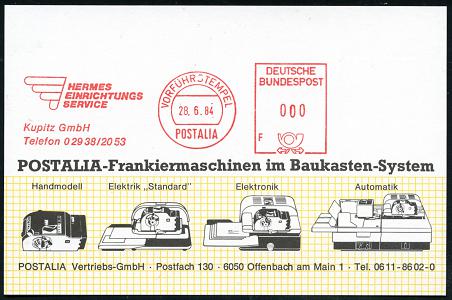 8311 | 18 € | PL-Raum 47.. (ohne Hamm) : Ense 1984 (28.6.) AFS.: VORFÜHRSTEMPEL/POSTALIA/HERMES/EINRICHTUNGS/SERVICE.. (stilis. Flügel) seltene Postalia-Musterkt. (= Specimen) | ![]() | |