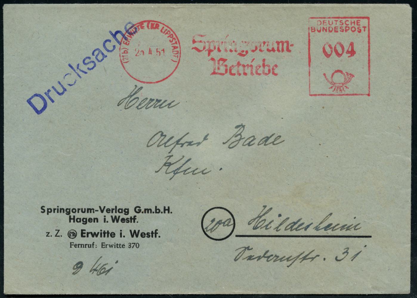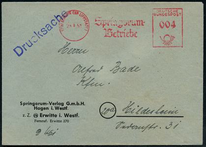 8313 | 18 € | PL-Raum 47.. (ohne Hamm) : (21b) ERWITTE (KR LIPPSTADT)/ Springorum/ Betriebe 1951 (25.4.) AFS Francotyp "Posthorn" auf Firmen-Bf.: Springorum-Verlag GmbH, Hagen i.Westf., z. Z. (21 b) Erwitte.., ausgelagert bedingt durch II. Weltkrieg n. Hildesheim (Dü.E-23BAo = Erstjahr!) | ![]() | |
