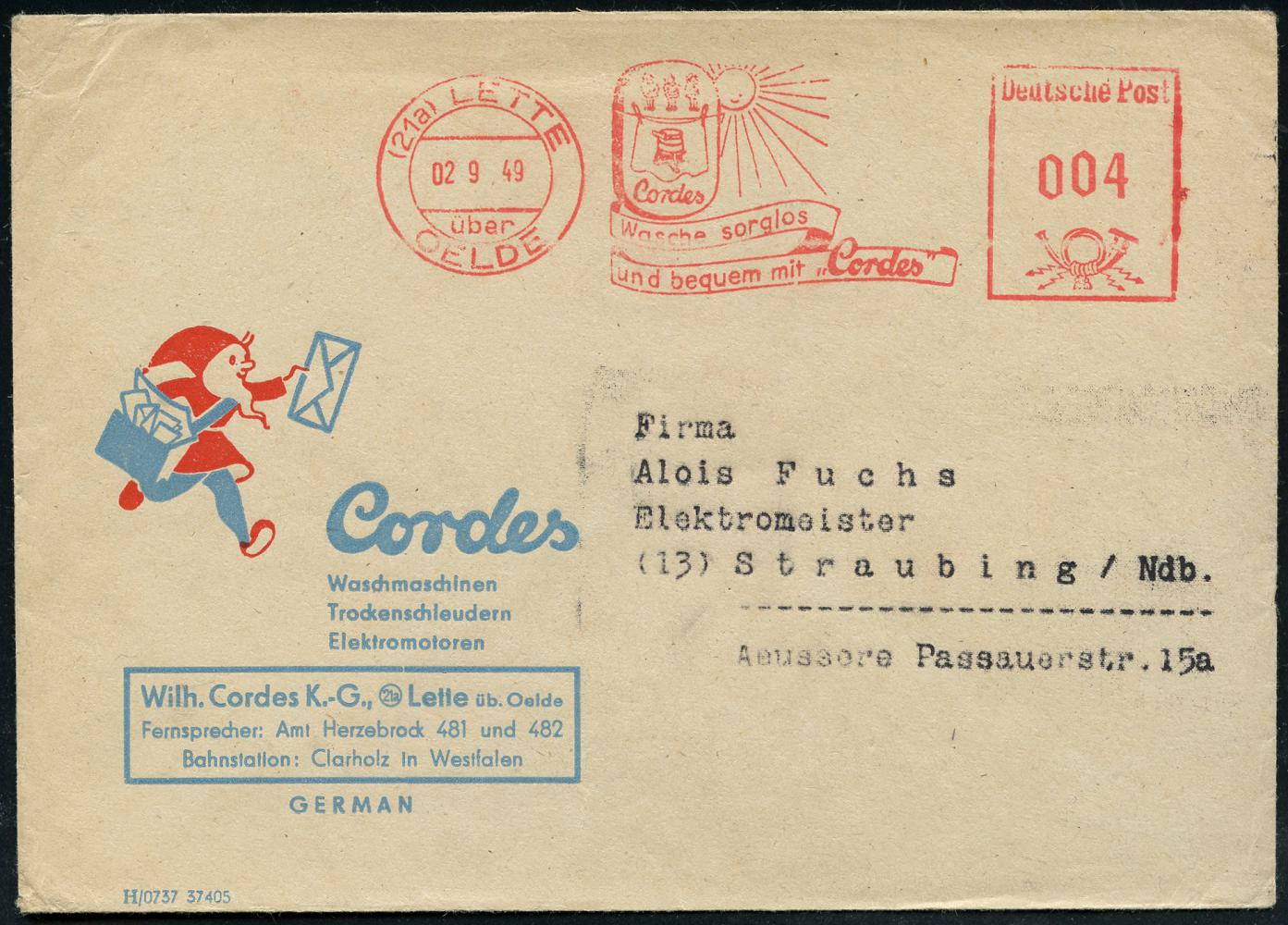 8316 | 18 € | PL-Raum 47.. (ohne Hamm) : (21a) LETTE/ Über/ OELDE/ ..Wasche sorglos/ u.bequem mit "Cordes" 1949 (2.9.) AFS Francotyp = PSt.I-Typ (Logo mit Waschriog, Sonne) Reklame-Bf.: Cordes, Waschmaschinen, Trockenschleudern, Elektromotoren.., rs. Landkarte! (Dü.E-20CGo) | ![]() ![]() | |