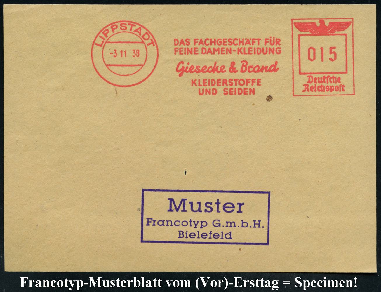 8320 | 35 € | PL-Raum 47.. (ohne Hamm) : LIPPSTADT/ DAS FACHGESCHÄFT FÜR/ FEINE DAMEN-KLEIDUNG/ Giesecke & Brand/ KLEIDERSTOFFE/ U.SEIDEN 1938 (3.11.) AFS-Musterabdruck Francotyp "Reichsadler" , glasklar gest. Francotyp-Musterblatt vom (Vor)-Ersttag !, selten! (Dü.E-5CGo) | ![]() ![]() | |